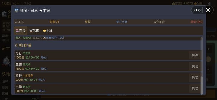 1.攻略方向说白了很简单,初期的核心玩法还是挣钱,攒粮,提高声望,前两者很容易理解。提高声望主要是增加家族品级,品级增加我们就可以在其他郡进行种地开商铺,初期兵力够应付突发时间即可(不考虑家族能力)2.关于后续剧情,玩家们讨论,我看主要是战争和生子的议论,首先目前战争系统还不够完善,只能说文字战争吧,有点像三国志系列后期游戏那样,到这步就可以平推天下,后续肯定要完善,但我目前没有喧宾夺主的想法