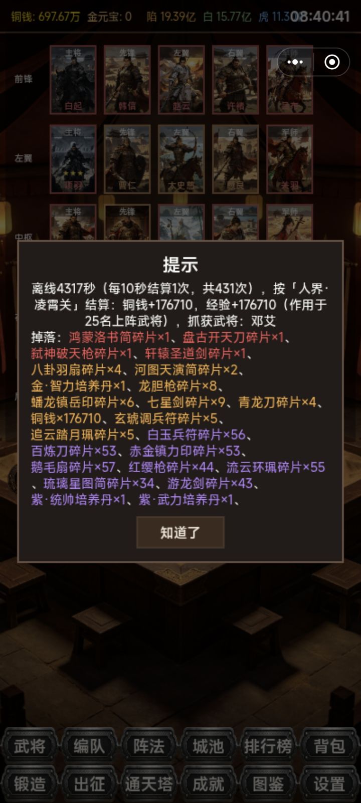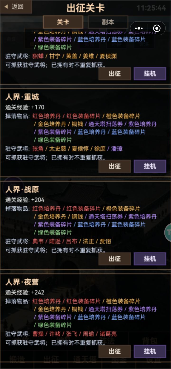 平时挺休闲解压的一款游戏。离线挂机也能玩。武将。可以自己在关卡里面抓。离线挂机也能抓的。广告挺少。玩法也在不断增加。每个武将都有自己的技能那些。还能选择阵法。进行额外的属性加成。更换的武将还可以直接返还经验。还有培养丹。没有损耗,不用再费心费力的去刷。值得一玩