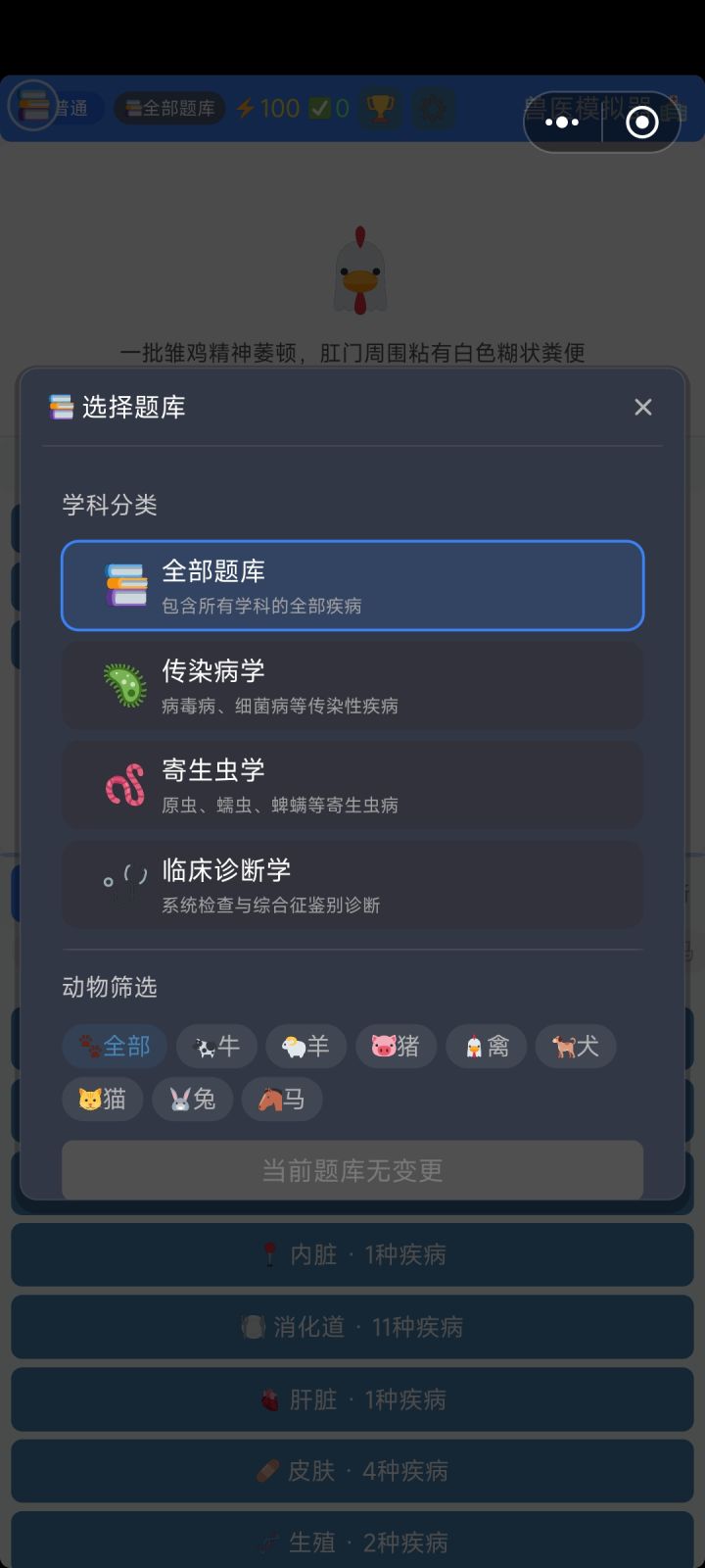 新增了寄生虫学的题库,可以进行科目和动物的筛选切换,更高效练习啦