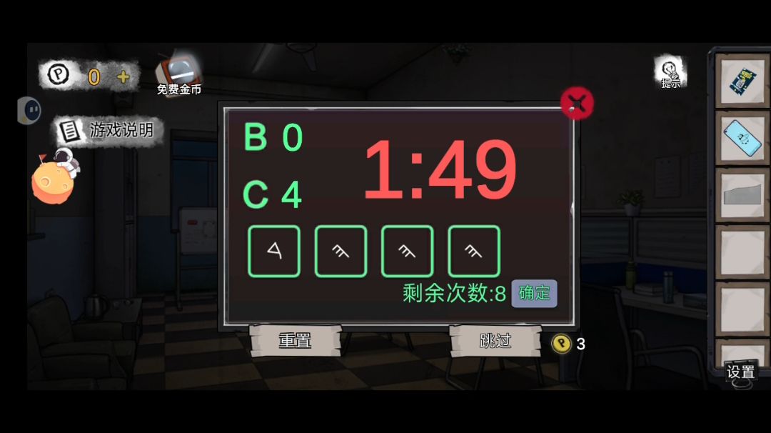 #游戏的基础规则# B为正确,C为错误。 中间初始为4个一样的符合一共有6个不同的符号,这里假设为a,b,c,d,e,f。每局游戏都会刷新一个正确符号排序 初始尝试次数为9,重置功能只会重置修改的符号和尝试次数,所以记住正确的符号排序,多使用重置功能。 #案例演示# 上图为初始界面,中间符号为aaaa左上角B1C3。说明正确的符号排序,其中一个符号就是a。 更换第一个符号并确认,左上角变为B0C4