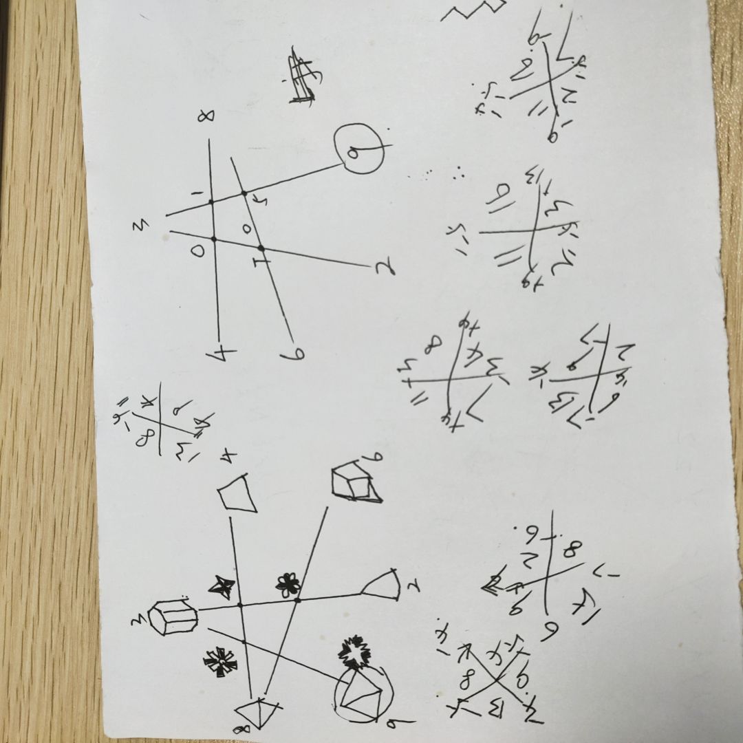 这是最后一个场景的箱子的推演图,其他的忽略就好了哈哈,每次刷新进去数字都会变化的,所以要自己推演,第一个是正面图,第二个是反的也就是纸条上的连接起来的。 以前上学的时候数学题都不一定打草稿,现在玩个密室都要打草稿了