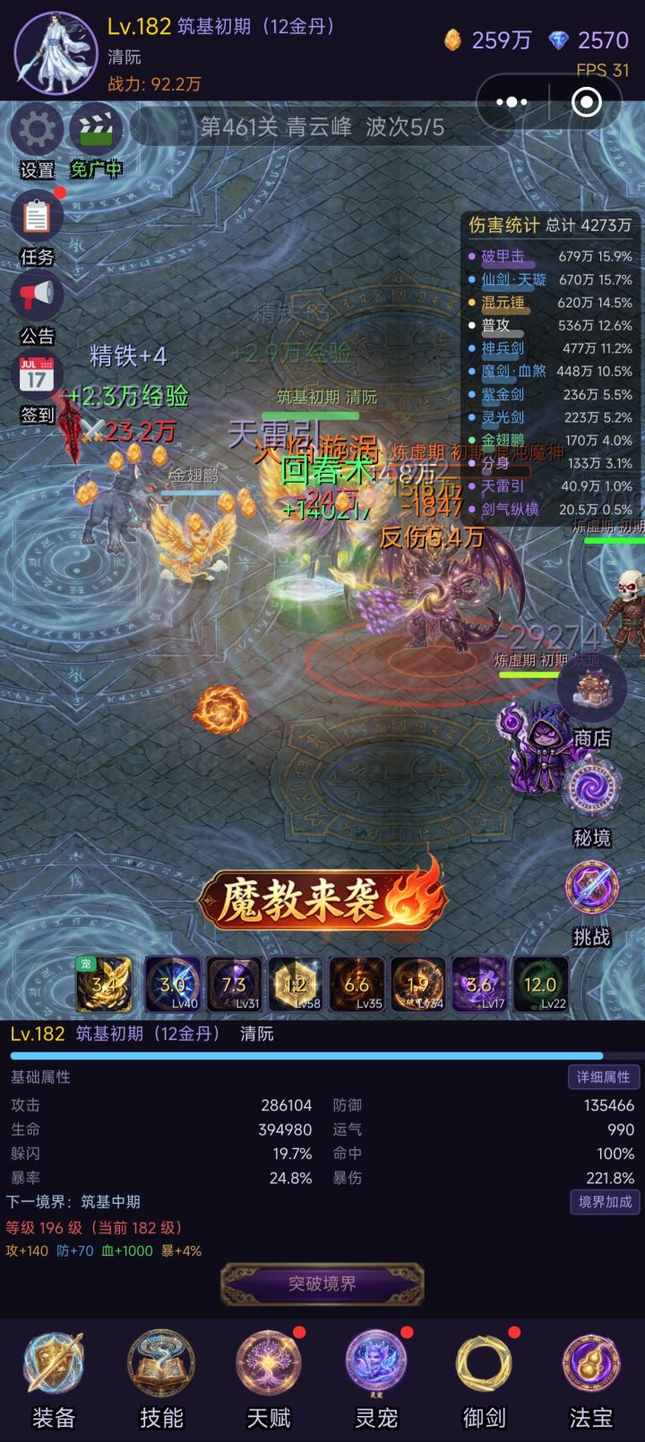 很不错的挂机修仙游戏,刷装备过瘾,很有成就感,广告不多,看到次数就可以免广告,好评!宠物,技能,装备,神器可提空间大,但又不会眼花缭乱不知道点哪。循序渐进感受自己变强