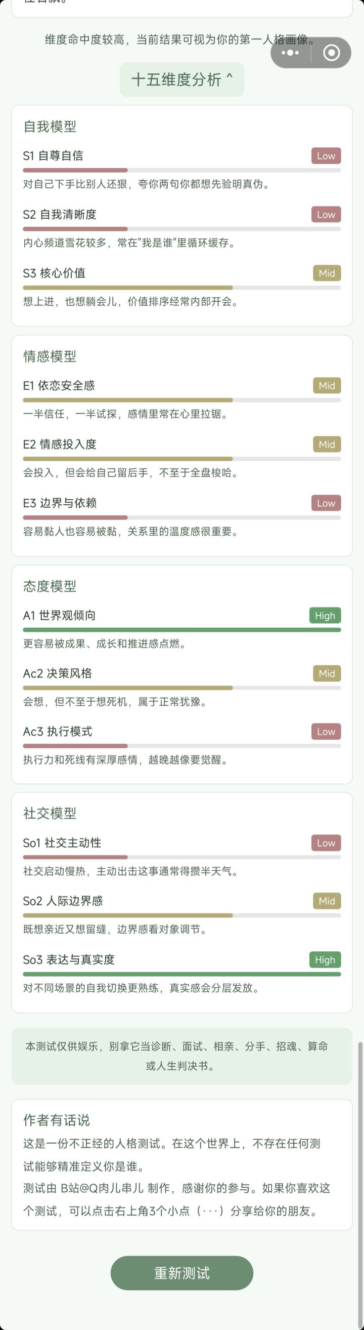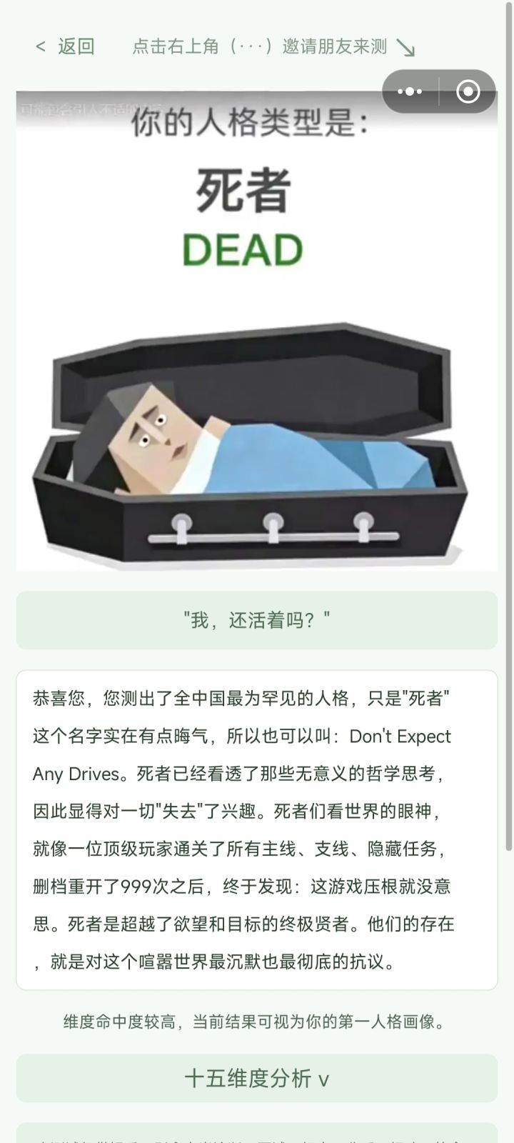总结一句话:它不是用来认知自我的心理工具,而是一次赛博狂欢的入场券。 建议放松心态,和朋友一起测着玩玩,快乐就完事了,别把结果当真,也别沉迷于“丧”标签。