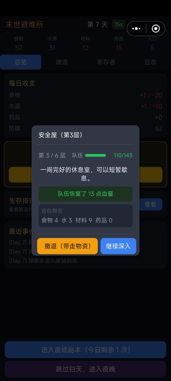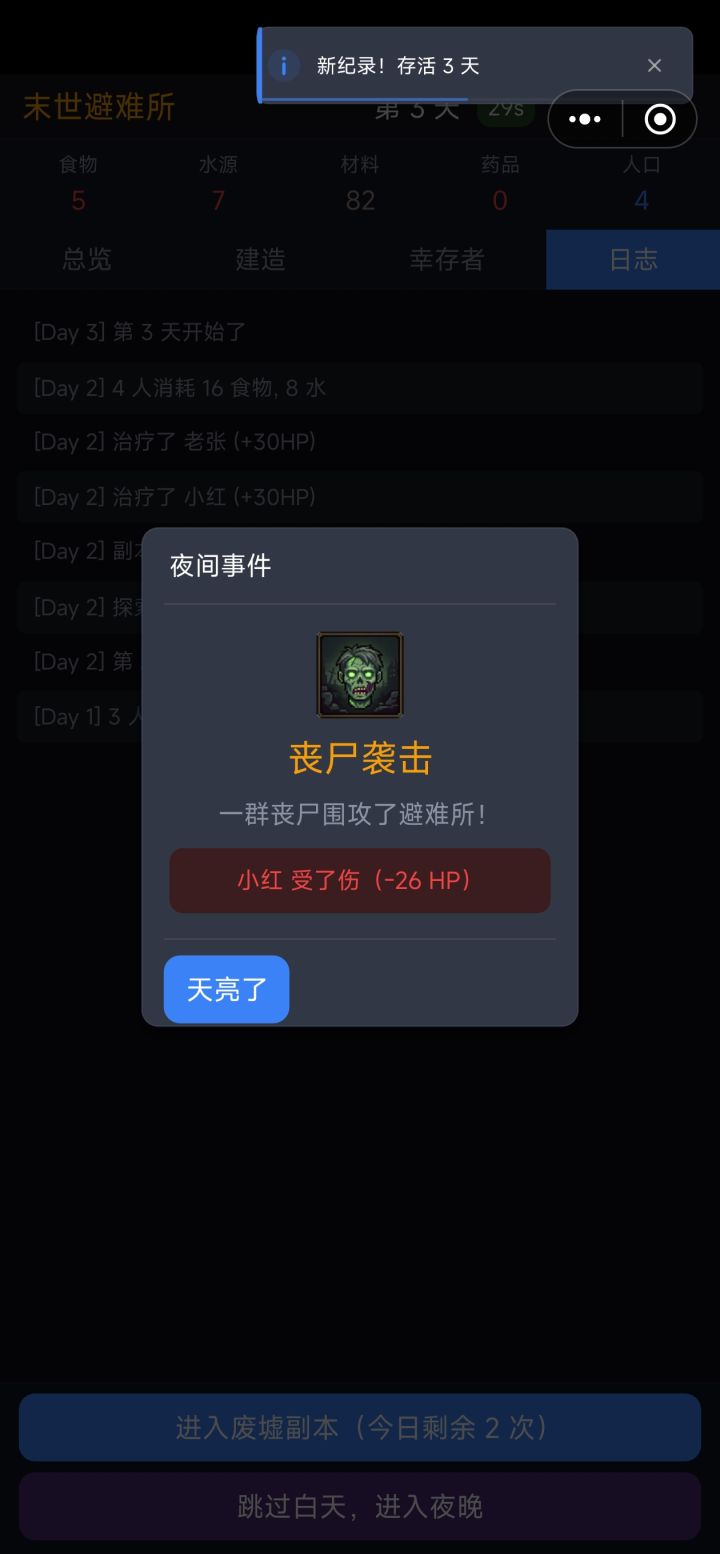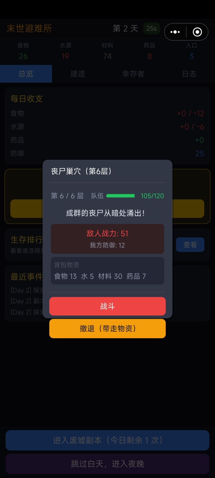 这游戏把末世生存的压迫感做得很到位。开局30食物20水,每日净亏6食物3水,资源倒计时从第一天就开始滴答响,逼着你必须在温饱与安全之间做出取舍——是优先升农场水井稳住基本盘,还是攒42材料升避难所扩容,或者35材料建防御塔应对尸潮?没有标准答案,每一步选择都有连锁反应。