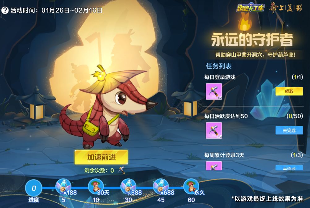 车友们过年好~大年初三不打烊,今天宝宝将为车友们带来葫芦兄弟的好朋友——勇敢善良的穿山甲,以及众多葫芦兄弟精彩活动。快来和宝宝一起看看吧~ 永远的守护者 1月26日-2月16日,福利站将开启【永远的守护者】福利活动。车友们每日完成指定任务可收集十字镐,帮助穿山甲加速前进,累计前进达到指定进度即可获得史诗宠物穿山甲哦~ 穿山甲 史诗/宠物 虽然没有超强的战斗力,但是有一颗坚强善良的心,永远守护着大家