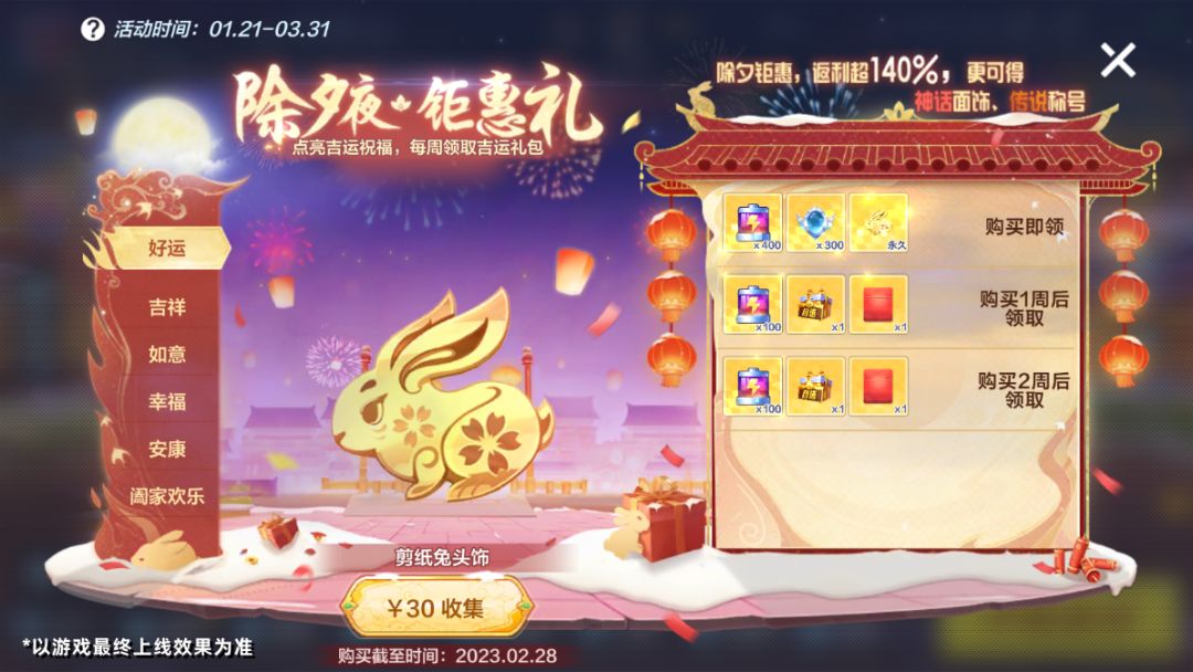 金兔迎春 距离新春佳节还有2天 除夕夜-钜惠礼 1月21日-3月31日,游戏内开启【除夕钜惠】理财活动,车友们可以在活动有效期内,使用直购的方式购买不同档位的吉运礼包,每购买1个礼包可点亮礼包对应的吉运祝福,购买后可立即领取相应的吉运礼包,待到达时间后可领取下一个吉运礼包,直至领取全部礼包(每种吉运礼包总计可领取3次)。点亮全部吉运祝福后即可获得吉运大奖——永久神话面饰【日月同辉面饰】、高概率防御