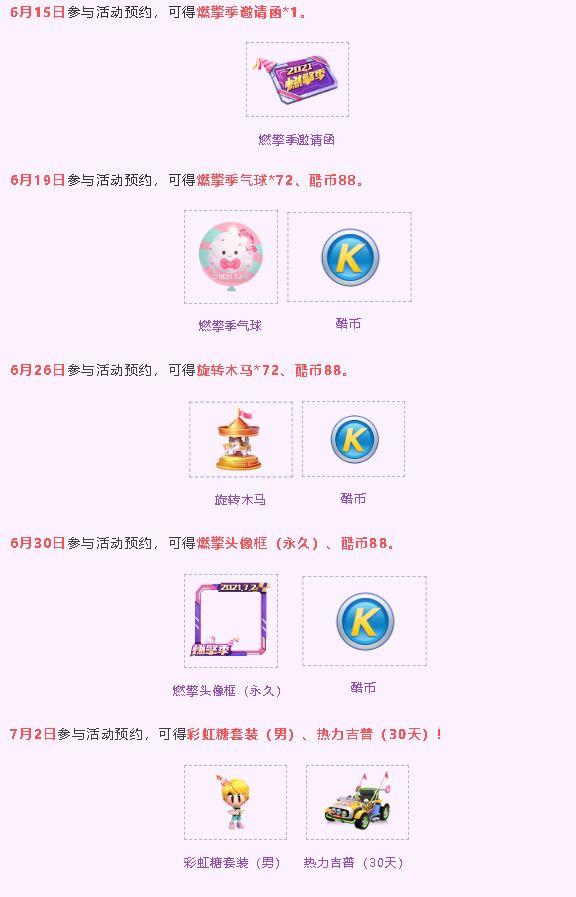周年庆的步伐正缓缓走来 繁荣山丘也日益变得欢闹 不仅有许多燃擎季主题道具等待领取 甚至从未听过的赛车引擎轰鸣 也传到了宝宝的耳朵里! 这必须得带车友们去一探究竟! 一、周年庆预约 6月15日-7月7日,车友们可在游戏中参与“周年庆预约”活动,领取丰厚周年庆回馈福利!并且在不同的日期参与,还会获得不同的奖励!所以车友们要拿小本本记好以下参与日期哦~ 其中旋转木马是热度礼物,每个旋转木马可以增加720