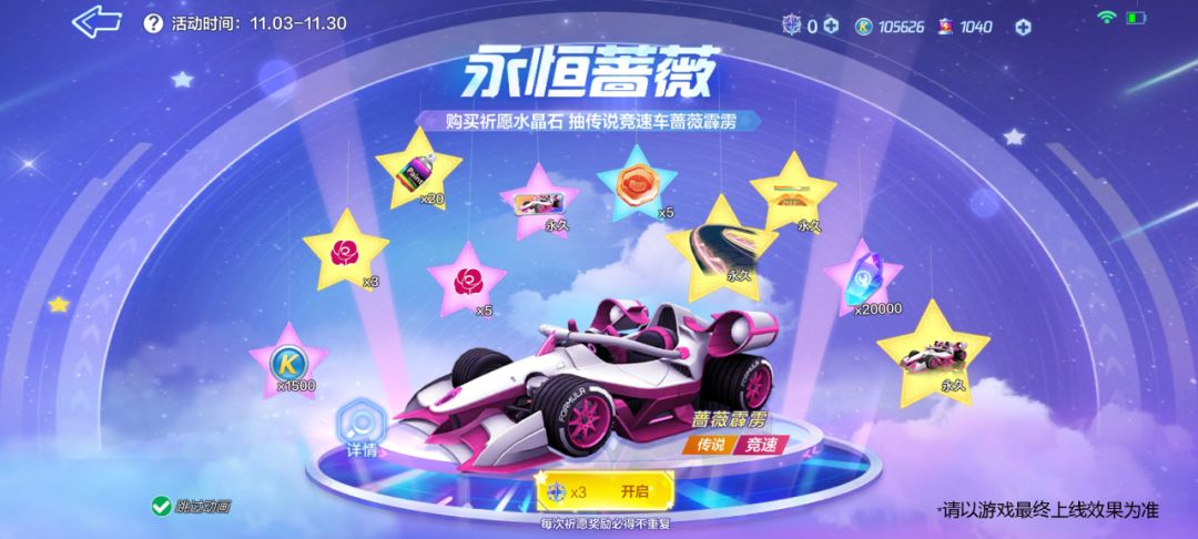 狂风裹挟着粉色花瓣 洋流汇聚着蓝色精灵 青春气息势不可挡袭来 在赛道上划过绚烂的色彩 全新传说竞速赛车蔷薇霹雳降临祈愿 新一期通行证上线黑焰席卷一切 能源竞技场再度开启 全新赤壁背景待你获取 更多内容和宝宝一起先睹为快吧~ 蔷薇霹雳祈愿行动 青春无敌,粉色风暴来袭!11月3日起,新一期祈愿行动开启,在粉色蔷薇的引领下展开全新探险!参与活动就有机会获得全新传说赛车【蔷薇霹雳】、【蔷薇霹雳印迹】、【蔷