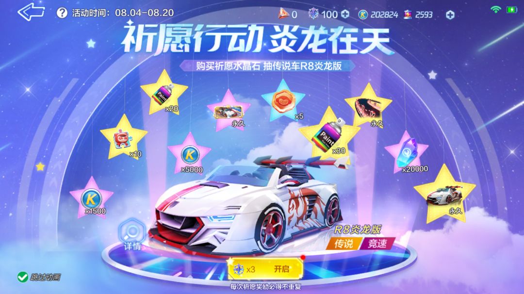 宇宙飓风,熠熠星火 漂浮在星空之中的 是太空科技的最新成果 以及融合了烈焰风暴的全新赛车! 新一期通行证今日上线 全新竞速赛车R8炎龙版来临 全新太空研究员套装免费送 烈日炎炎高温补贴乐享不停 快来和宝宝一起先睹为快吧~ 祈愿行动 炎龙在天 R8炎龙版 星火坠地,炎龙在天。8月4日起,新一期祈愿行动开启,极致进化引领性能巅峰!参与活动就有机会获得全新传说赛车【R8炎龙版】、【R8炎龙版印迹】、【R