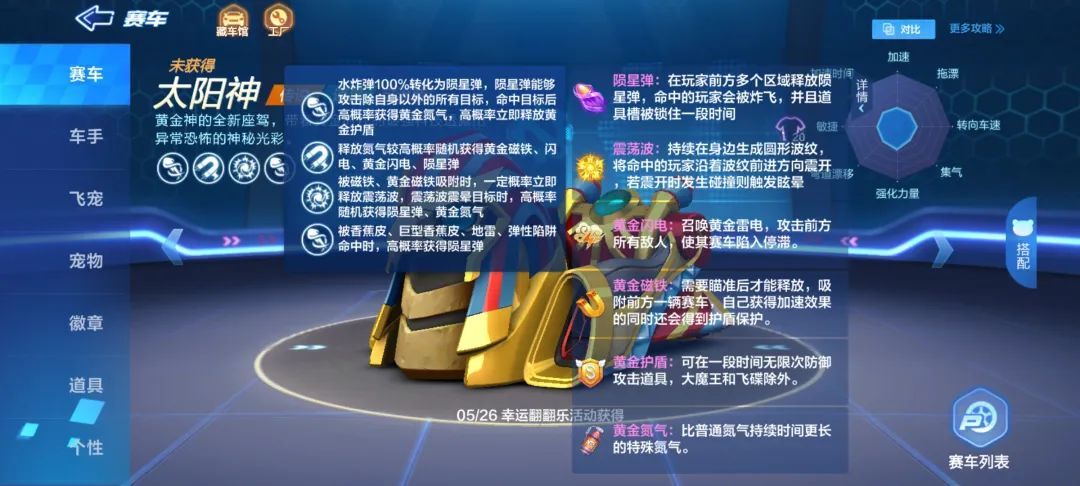 太阳神是2023年5月26日S24赛季通过幸运翻翻乐获得的一辆传说道具车。是一辆辅助上位车。陨星弹可以看成是换了皮的天火,和天火的区别在于陨星弹敌我不分,而天火不会伤到队友。陨星弹命中目标后高概率获得的黄金氮气以及立即释放的黄金护盾保证了太阳神在上同时具备了不错的防御力,释放氮气随机获得的4个道具进一步强化了太阳神的后追和掩护能力,被2种磁铁吸附时一定概率立即释放的震荡波是把双刃剑,有可能会误伤队