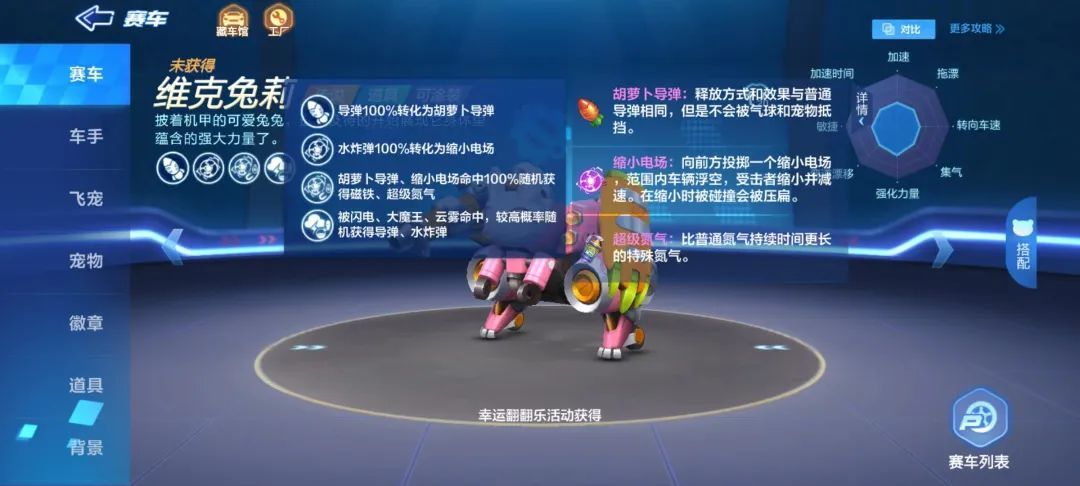 维克兔莉是2022年8月5日S19赛季通过幸运翻翻乐获得的一辆传说道具车。是一辆辅助上位车。维克兔莉可以通过道具箱获取两种特殊攻击道具,胡萝卜导弹不会被气球和宠物抵挡,缩小电场和普通水炸弹投掷距离相同,效果是范围内车辆浮空,受击者缩小并减速,在缩小时被任何其他赛车碰撞会被压扁,最多压扁2次。缩小电场是目前攻击道具中影响最长的道具,一般会影响6到7秒左右,如果被压扁会有将近10秒在原地或者只能小幅缓