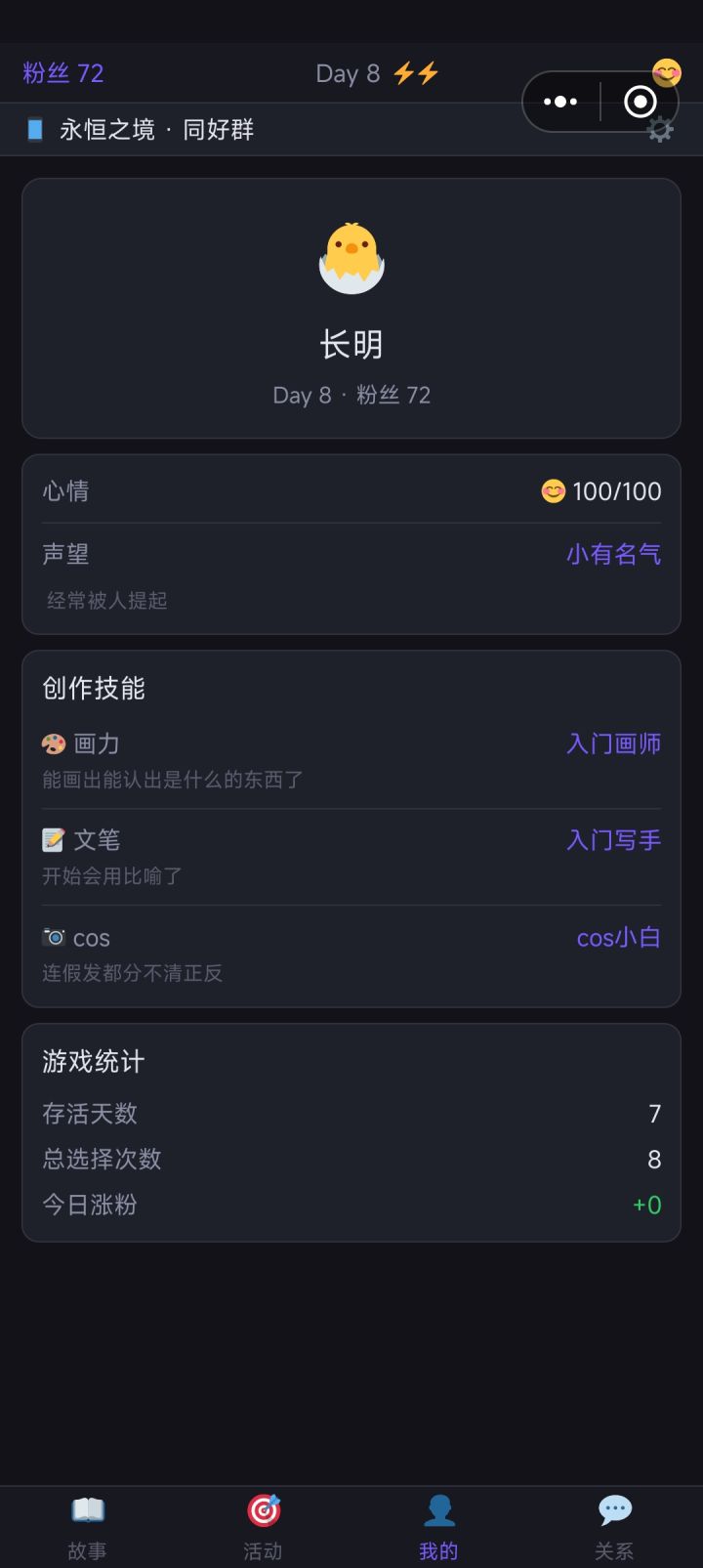 真的是第一次玩!p1是我的角色页面。“长明”是我一直在用的一个名字,三年前给自己的取的,曾经在抖音上被人夸过好听,也用这个名字体验过许多游戏,也曾经用这个名字进行过创作。这次玩游戏也顺手取了这个名字,没想到玩着玩着出现了另一个“长明”!当时还以为是路人视角的玩家,看到“长明+2”才反应过来。这感觉实在太奇妙了……