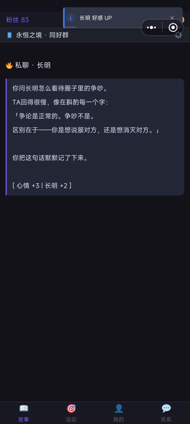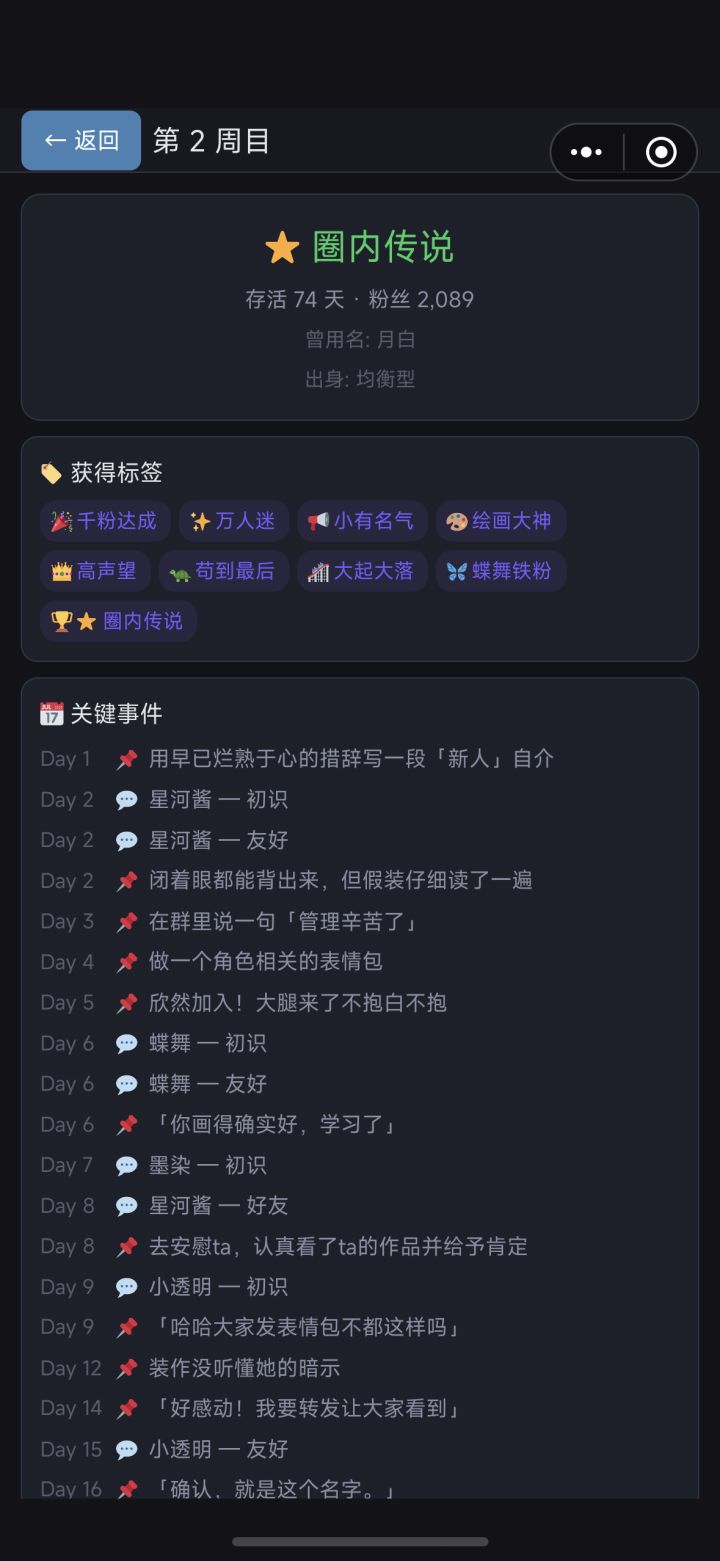 大家好,这次更新对游戏做了一轮全面体检,修了一批影响体验的问题,也对部分数值做了调优。 一、问题修复 集中排查并修复了多项问题,涉及事件触发、NPC 对话、UI 显示等多个方面: [重复事件]部分剧情事件在特定条件下会重复出现,已修复。 [深层剧情解锁]某些 NPC 深层剧情线的解锁条件过于严格,导致难以触发,已调整。 [对话匹配]NPC 私聊偶尔会出现不符合当前关系