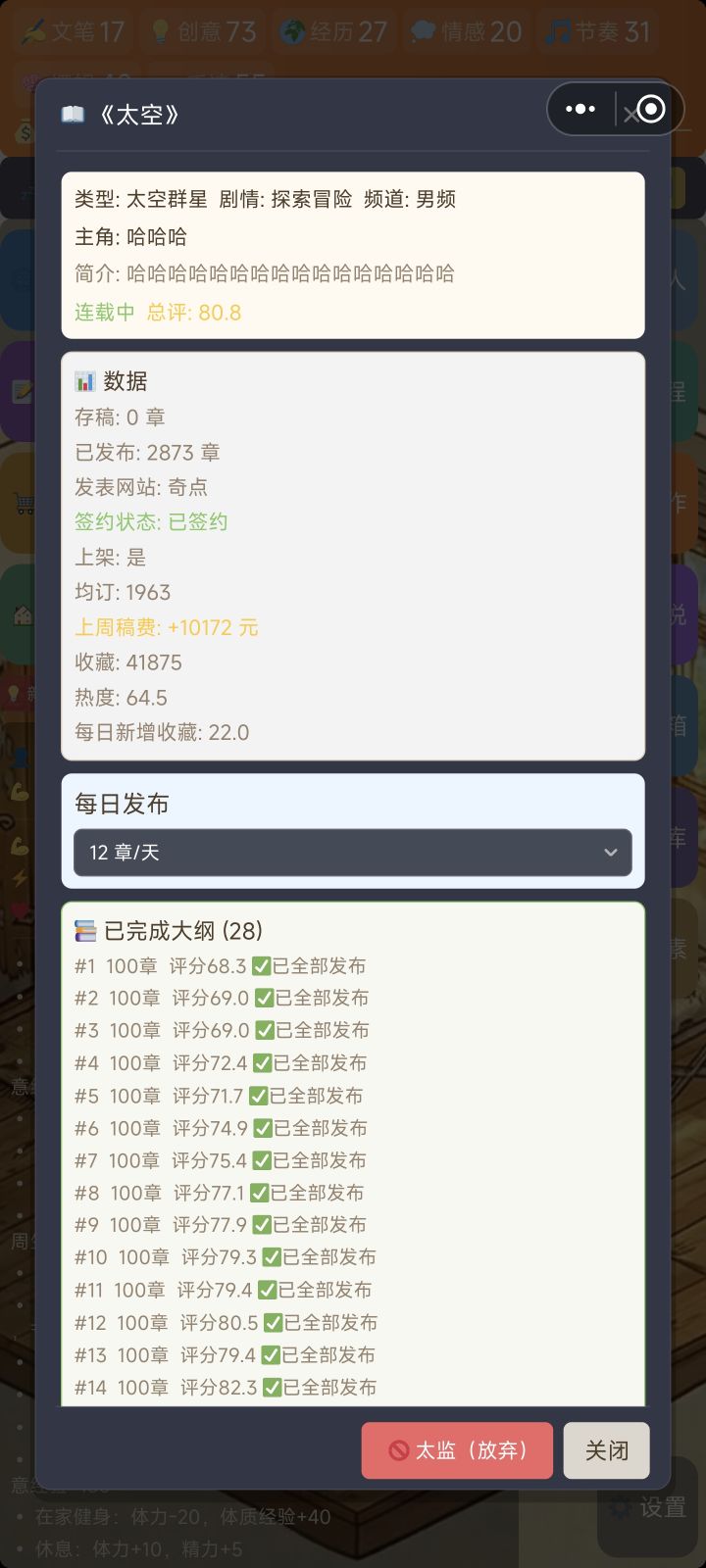 很好玩,深度玩家,16小时了,财富自由,但是有几点,首先后期手速上来,这个大纲一个礼拜不到就要重写,都后期了攒钱买别墅了,太复杂了,重复操作没有必要性。每次都是保存的直接下一步下一步,建议追加一个自动延续大纲功能,不行的话就把大纲上限扩到1000章,其次家具很多人说了作者大大说了马上更新,没问题,然后还有重要的一点,网站那边的作者数量读者数量盗版猖獗等等会随年代浮动,甚至到一定年数会有新的网站出现