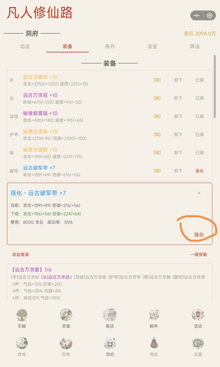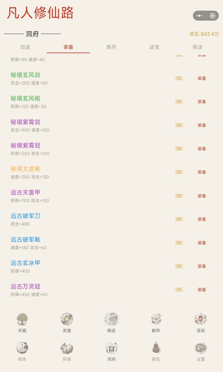 凡人修仙路攻略(v1.1.3版本后4.24) 第二天攻略。V1.1.3版本更新了秘境产出套装和新增法宝。这样子的话第一天禁区第九层都能打过。相当于第一天所有的基础全部打好。后面只需要无限飞升并且打秘境和远古套装。秘境套装用存档法每套预计3-6天就能全打到。切记上锁。远古套装不着急打,因为战力不够,可以每日商店先买藏宝图攒着。 第一天晚上在化神,之后挂一晚上,第二天早上就够大乘了方便飞升。我是第