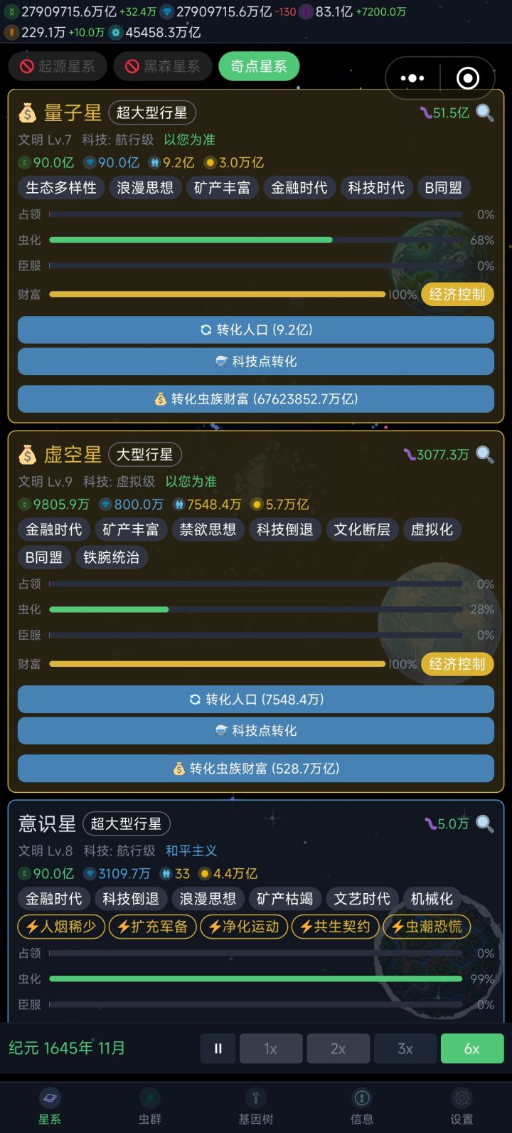 在之后就是慢慢给虫巢升级,解锁科技、虫族之类的。慢慢从一小块区域到一个星球。