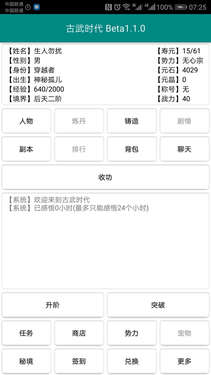 新手攻略:先感悟一个小时后收获经验,然后升级去副本打怪可以去领取新手礼包礼包码:667707通知:古武时代1.1.2准备大整改改为全新挂机文字游戏新游戏:仙尘缘-初始工作室制作仙侠奇缘-蜘蛛工作室制作删档通知:本游戏于1.1.1版本删档充过钱的玩家加作者QQ:2749179475发放补偿,请见谅