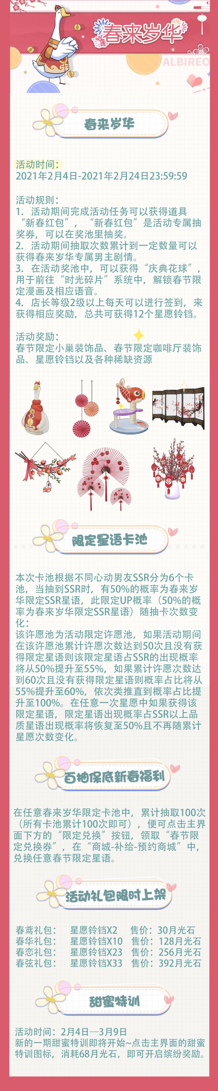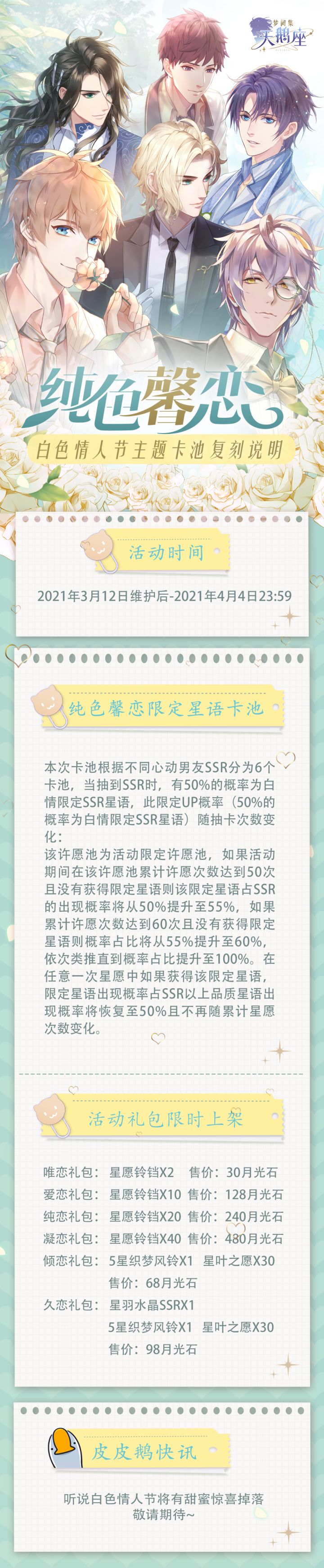 亲爱的店长大人:天鹅座将于2021年3月12日 14:00-16:00 进行维护更新。维护更新期间,店长们将无法登录游戏,请各位合理安排时间,避免不必要的损失。开服时间根据实际情况可能提前或延后。更新完毕后,我们陆续发放维护更新补偿【星钻*100、体力*50】,感谢大家的理解与支持。初春的风自青空而来,越过大街小巷,留下馥郁花香,而恋情早在约定之地悄然生长。白色情人节卡池复刻活动即将开启: