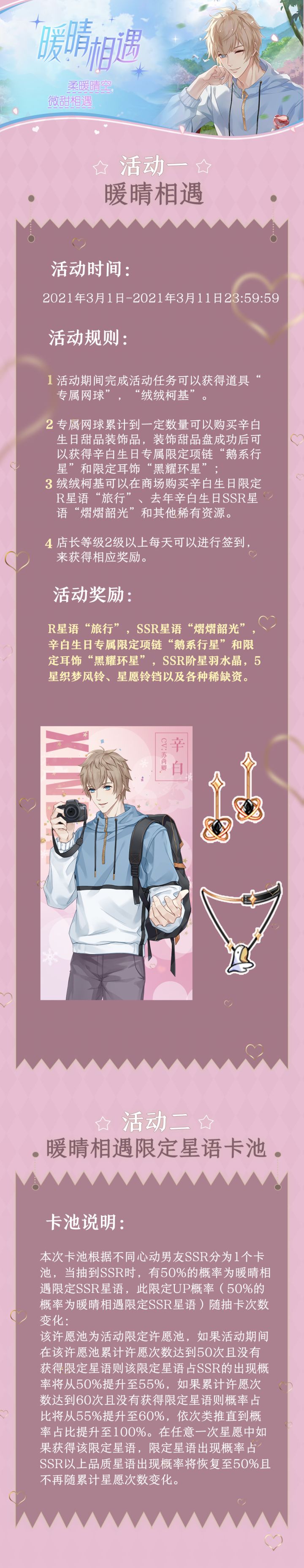 亲爱的店长大人:天鹅座将于2021年3月12日 14:00-16:00 进行维护更新。维护更新期间,店长们将无法登录游戏,请各位合理安排时间,避免不必要的损失。开服时间根据实际情况可能提前或延后。更新完毕后,我们陆续发放维护更新补偿【星钻*100、体力*50】,感谢大家的理解与支持。初春的风自青空而来,越过大街小巷,留下馥郁花香,而恋情早在约定之地悄然生长。白色情人节卡池复刻活动即将开启: