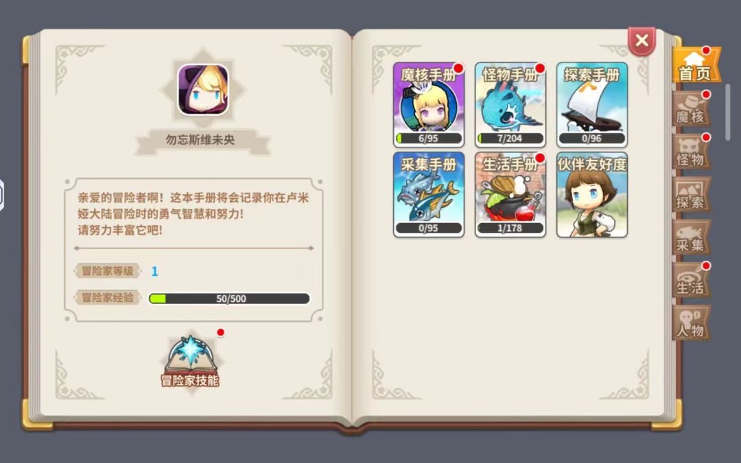 [表情_比心]光明勇士手游手册有什么作用? 首先在手册界面中,我们可以看到分为六大项,分别是魔核手册,怪物手册,探索手册,采集手册,生活手册以及伙伴友好度。 其实手册就相当于是图鉴玩法,记录了玩家在这个游戏中所获得的图鉴。 例如魔核手册中,有各种不同的魔核总览,每当收集到一个的新魔核就可以点亮对应的图标,点亮图标后玩家可以获得一定的经验值、银币、金币和勇士徽章的奖励。手册图鉴非常多,通过
