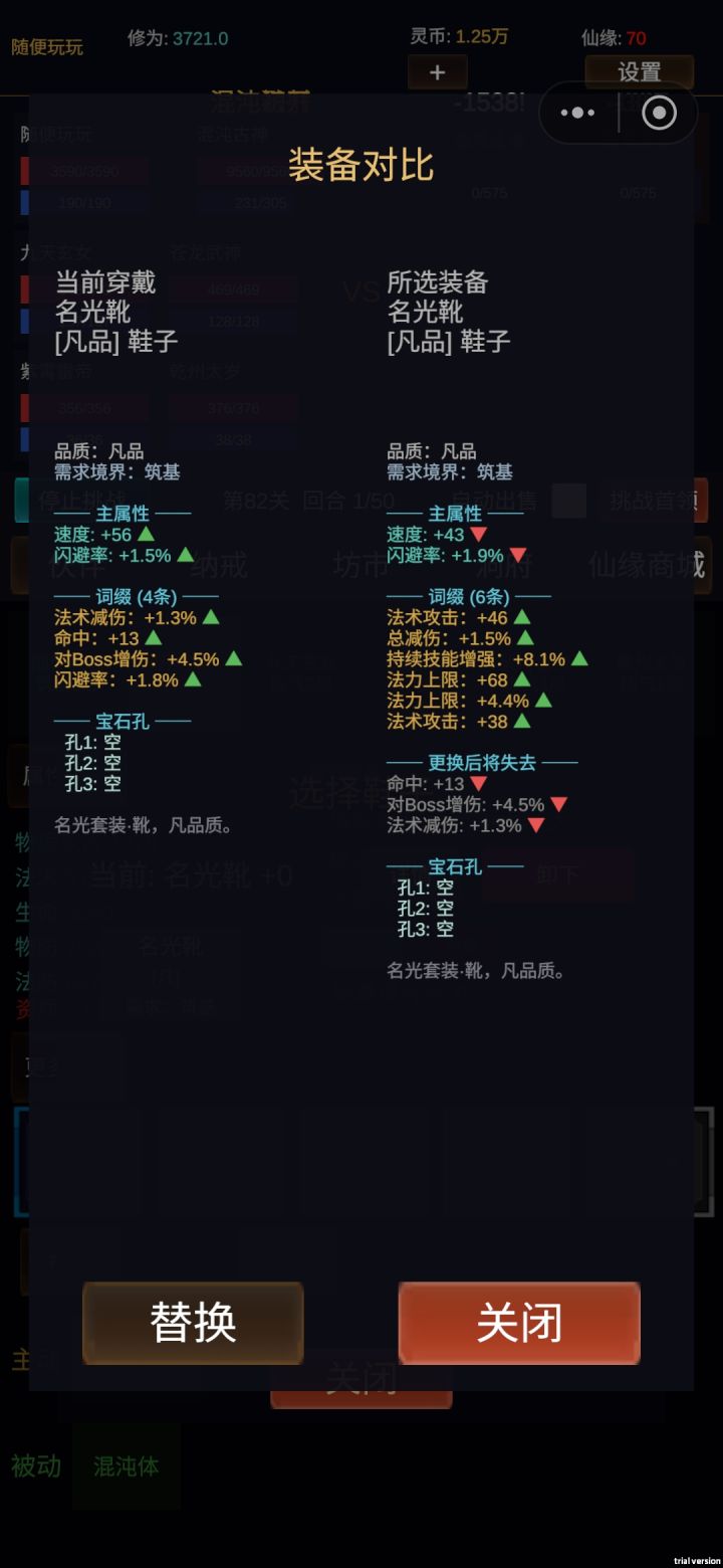 1.优化体验 搜索从3秒降低至1.5秒。2.装备详情面板与装备选择面板 新增境界显示。3.去除原来所有的技能 并且玩家购买的技能 已经使用或者在背包中 会1/1转化为灵币。4.新增技能 仅可主角使用。5.去除升星功能,已经升星玩家 进行1/1使用资质丹进行补还。6.伙伴全体重做,自带一主动一被动技能。7.挂机修为增加。8.优化装备词缀,随机词条上限最高7条 同词条最多3条同样的。9