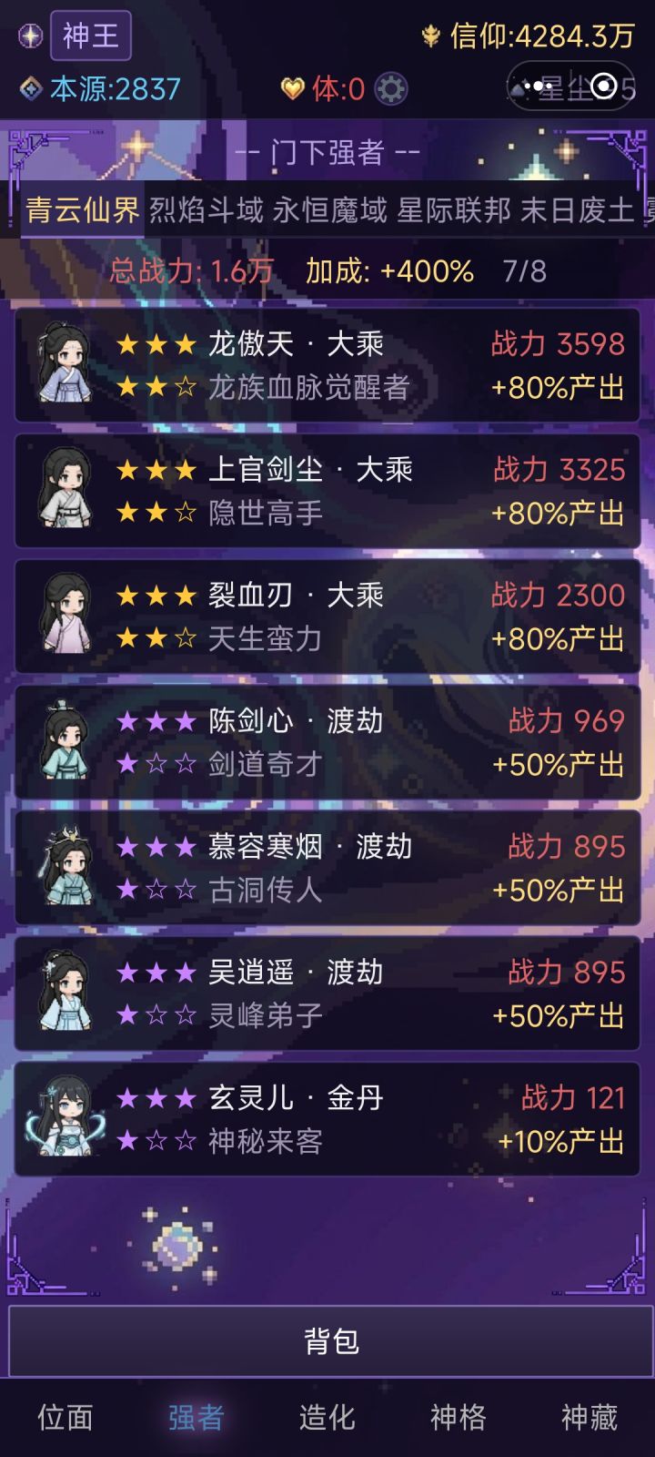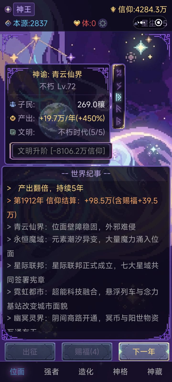 各位神明大人,v1.2 版本正式上线!本次更新带来了全新的修炼之路和诸多体验优化。【新内容】神格之路·新境界开启:修炼之路不再止步于!新增古神、太古神、万界之主、至高神四大全新神格境界,每个境界解锁更多位面与更高的位面等级上限,十重天道,等你攀登神格成就扩展:新增多个神格突破成就,突破即可领取丰厚星尘奖励数值显示优化:信仰数值新增"极"、"次方"等更高单位显示,再大的数字也能一目了然新增