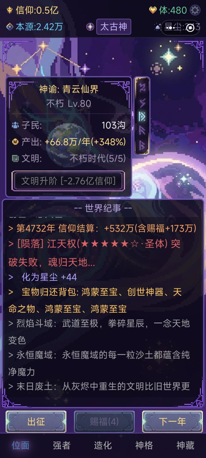 各位神明大人,v1.2 版本正式上线!本次更新带来了全新的修炼之路和诸多体验优化。【新内容】神格之路·新境界开启:修炼之路不再止步于!新增古神、太古神、万界之主、至高神四大全新神格境界,每个境界解锁更多位面与更高的位面等级上限,十重天道,等你攀登神格成就扩展:新增多个神格突破成就,突破即可领取丰厚星尘奖励数值显示优化:信仰数值新增"极"、"次方"等更高单位显示,再大的数字也能一目了然新增