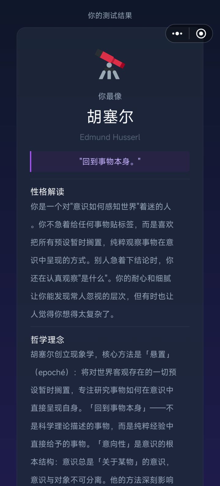 准倒是还挺准,我确实挺烦人的,只不过这里面哲学家太少了,欧陆里面都没几位,只能说做着玩还不错,按照主流哲学史来看是缺了现象学(这个是真的完全缺一个代表人物,甚至题目里面有偏向现象学的选项),宗教学(奥古斯丁,伪狄奥尼索斯,阿奎那)怀疑论(休谟先辈被康德肘翻了,太伟大了三大批判😭),泛神论(斯宾诺莎),法哲学(施密特,卢梭,洛克,霍布斯等等,当然还是如果,如果柏拉图的正义论(理想国)算的话但是我觉得