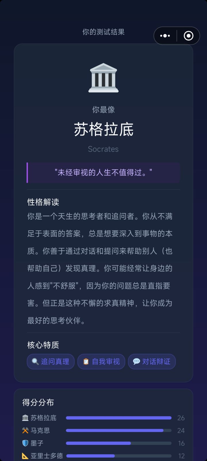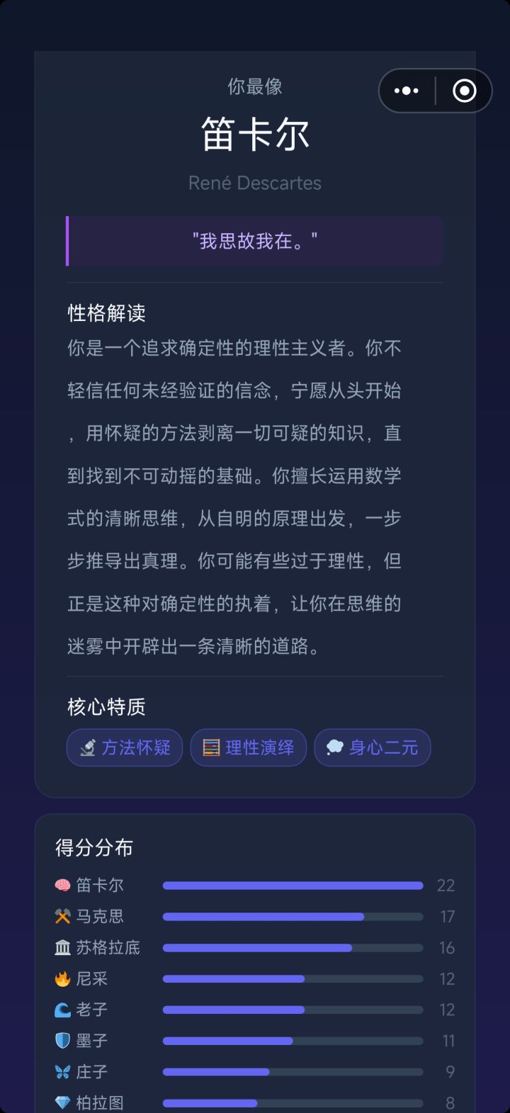 准倒是还挺准,我确实挺烦人的,只不过这里面哲学家太少了,欧陆里面都没几位,只能说做着玩还不错,按照主流哲学史来看是缺了现象学(这个是真的完全缺一个代表人物,甚至题目里面有偏向现象学的选项),宗教学(奥古斯丁,伪狄奥尼索斯,阿奎那)怀疑论(休谟先辈被康德肘翻了,太伟大了三大批判😭),泛神论(斯宾诺莎),法哲学(施密特,卢梭,洛克,霍布斯等等,当然还是如果,如果柏拉图的正义论(理想国)算的话但是我觉得