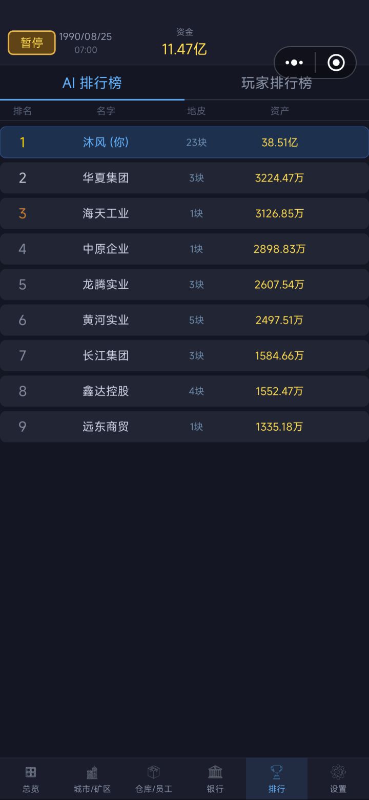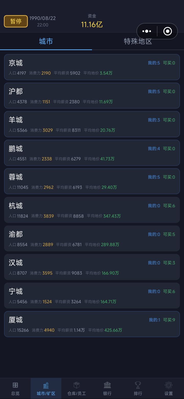 交流群1040257538一、新增内容 1. 新增出租车公司2. 矿区新增一键招募500员工按钮3. 新增全局工厂总览页面4. 2000年新增3个超级城市5. 玩家手动保存游戏数据时,将自动上传云端 二、功能优化 1. 调整城市动乱机制,移除动乱波及强制征收地皮、填路造海设定2. 矿区流拍后,20%储量将上架采购市场3. 城市购买地块后可自定义改名4. 收支趋势显示调整