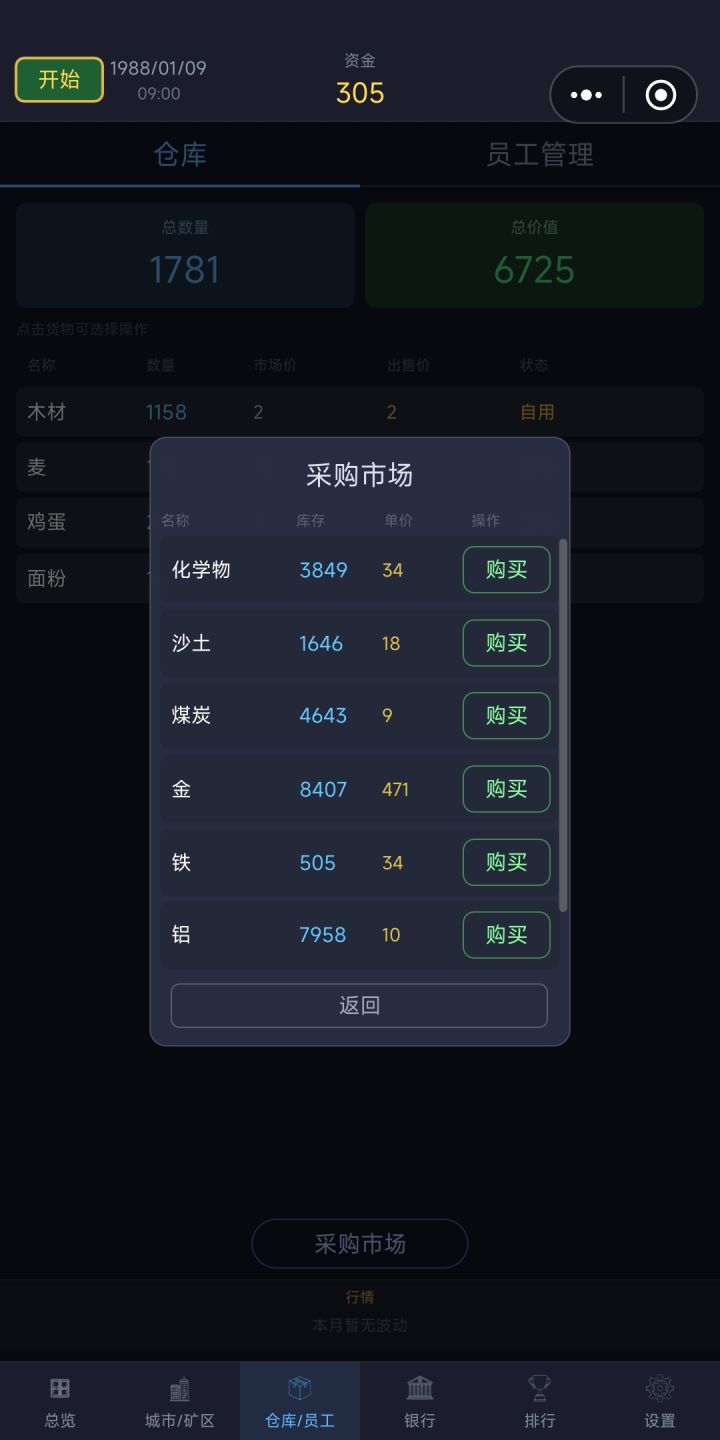交流群10402575381. 修复玩家排行榜排名不准确问题2. 优化仓库数值显示,解决数字换行、数值变动界面跳动问题3. 扩大矿物存储容量上限4. 云端存档调整为每个游戏月自动上传一次5. 新增股市模拟交易功能(暂未开启)6. 银行界面迁移至总览页面7. 采购市场新增市场价显示8. 优化重做新手教程内容9. 修复配方选择点击无响应问题10. 修复排行榜滑动卡顿问题11. 修