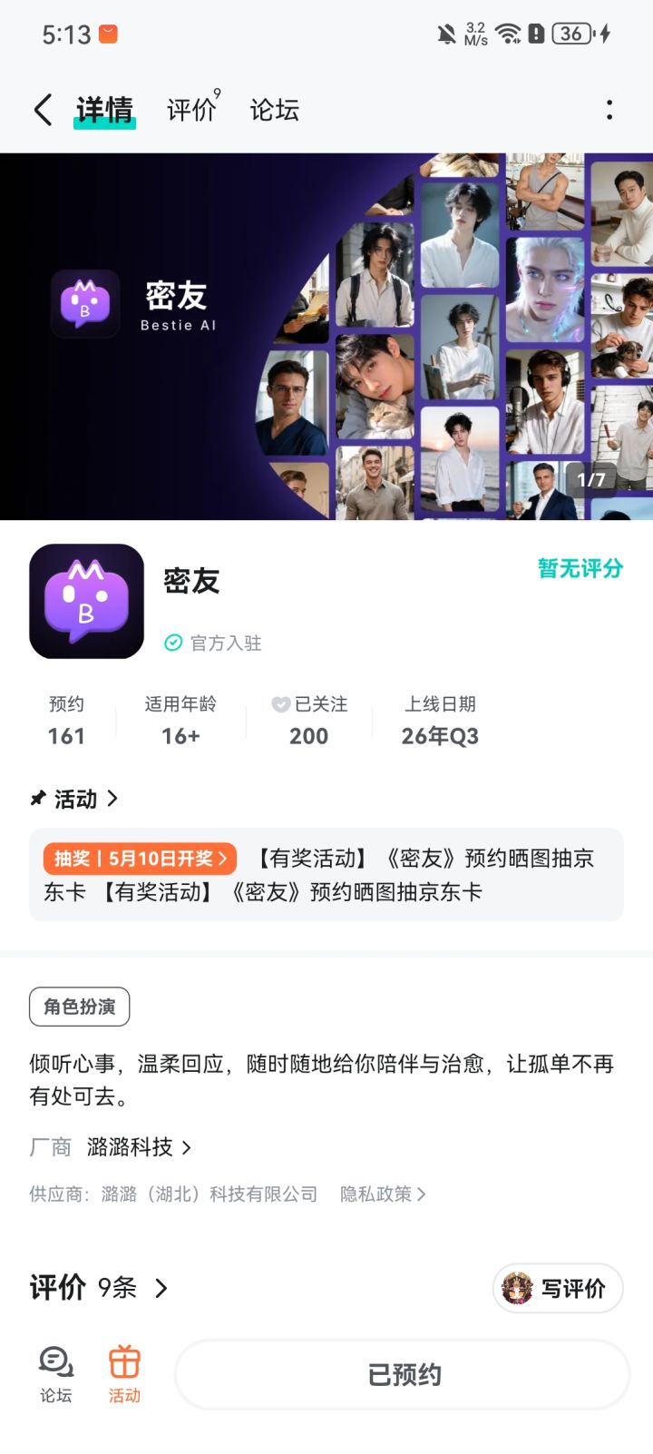 论坛专属活动已启,速来参与赢福利!打开 AI 聊天,遇见心动帅哥,每一句都聊到心坎里【参与方式】1.点击关注预约游戏并发新帖晒截图 2.在本帖下方评论区分享发帖链接即可【活动时间】即日起至5月10 日【活动奖励】随机抽取1名符合参与条件的玩家获得:50元京东卡一张【活动规则】1.内容禁止涉及暴力、色情、政治、恐怖内容,违者做删帖处理并取消活动资格;2.回复内容需与活动主题相关
