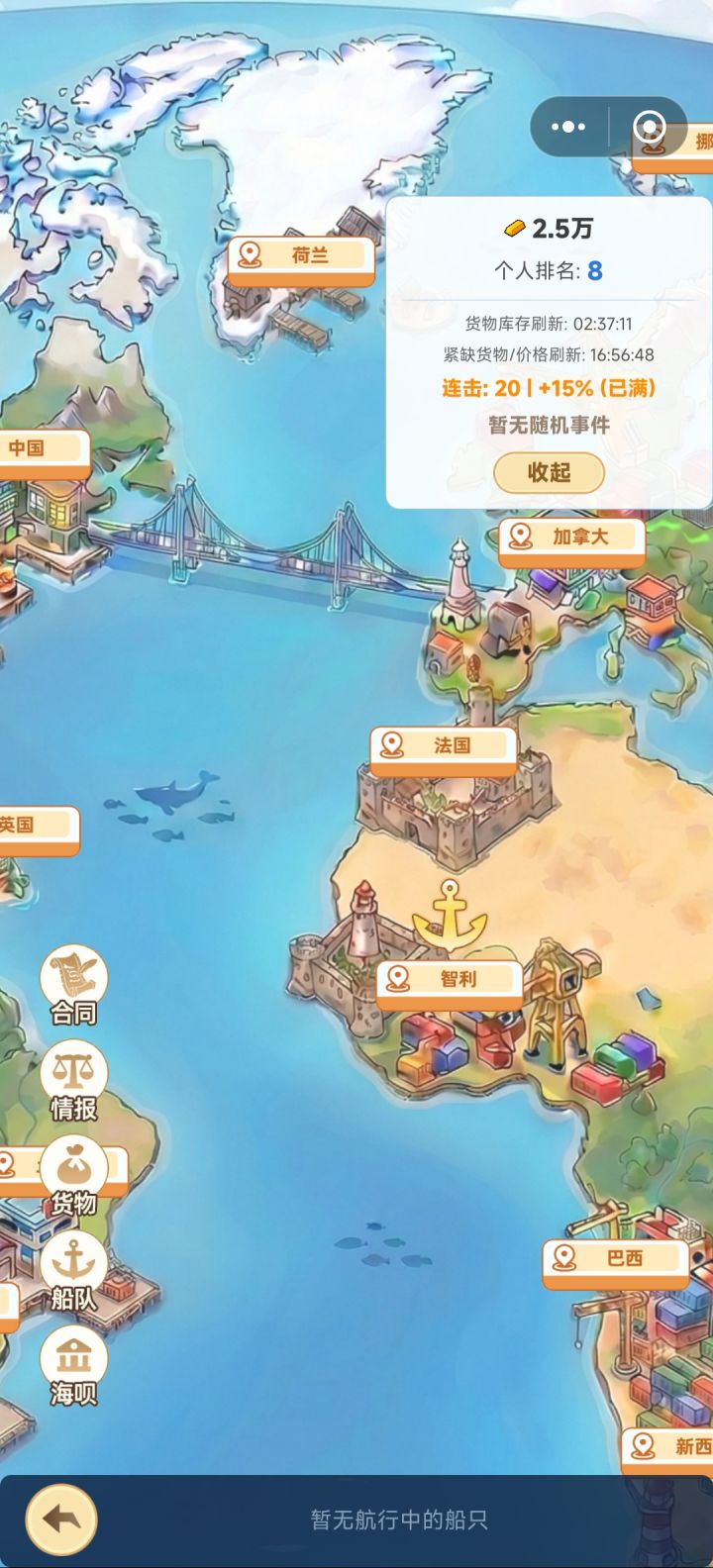 开局攻略(0~30 分钟)你的初始资金是 8000 金砖,只有 1 艘小船(运力 30)。第一步:签到 每天记得签到领金砖和石油,7 天一轮循环。第二步:第一笔交易* 你从中国出发,中国特产是 🏺 瓷器(基础价 800)* 在中国低价买入瓷器,装满船* 查看情报面板,找到瓷器的紧缺国(巴西、法国、南非)* 选一个目的地出发第三步:到达后立即卖出 到达目的地后,把瓷器全部卖出,然后在