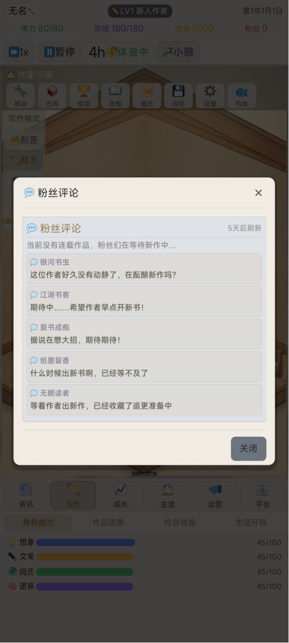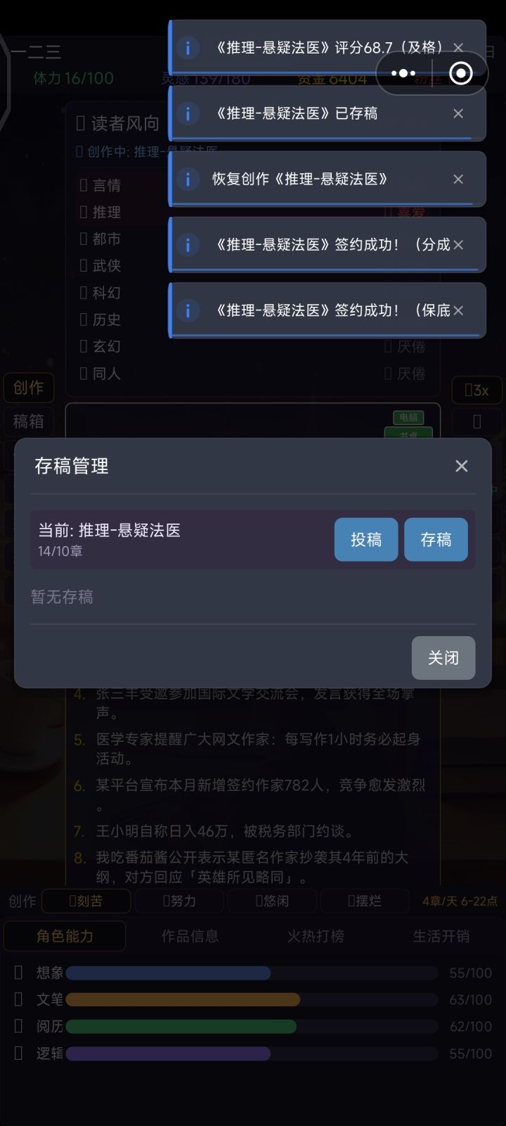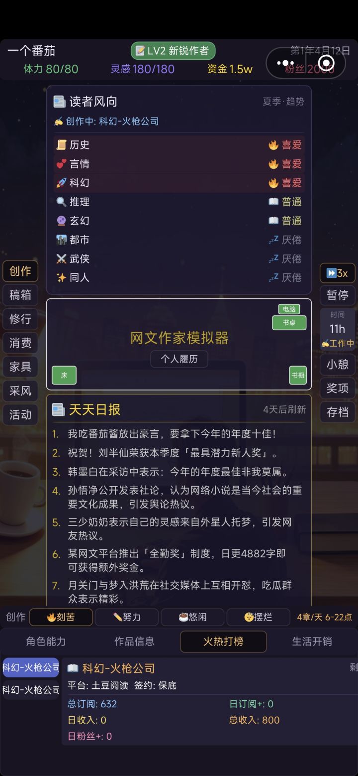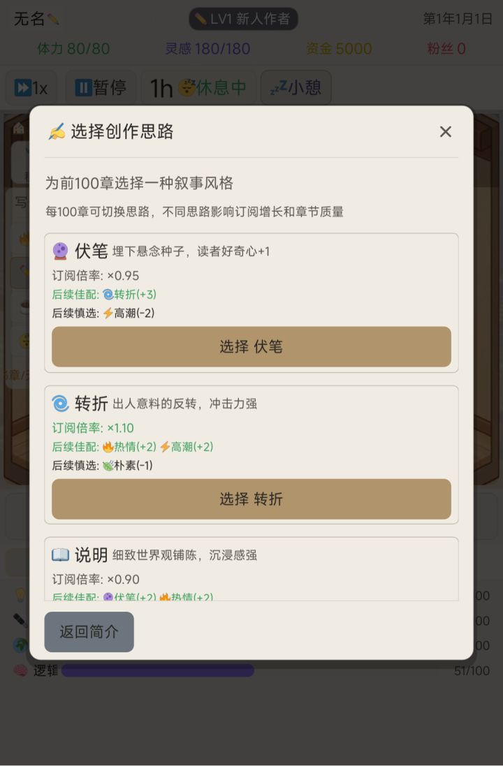 还想和您说明一下新版本的更新。1.剧情投入修改后可以在四项剧情中轮替,保证你一直是通过剧情在加分。之前由于我拉长了剧情恢复期,一般要在6个剧情中轮替,所以难度同样是下降的,这个对于老玩家应该不是坏事。对于新玩家,则通过爬山开剧情盲盒,推动很多人走上题材专精的路线。2.我加入了8个NPC作家,可以着重去刷自己专长领域作家的好感度,可以通过商定作品提高作品综合评分,这也是为了给经验不足,选错了剧情把作品分数搞底的玩家,多一条救赎之路,大致如此,祝你开心