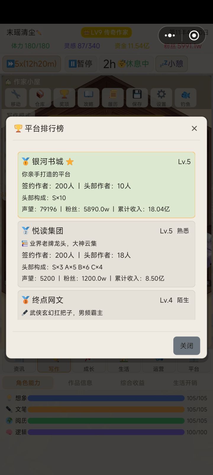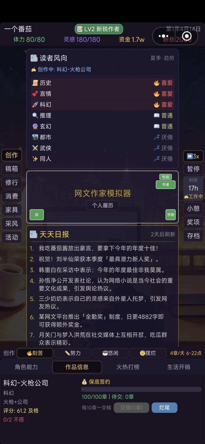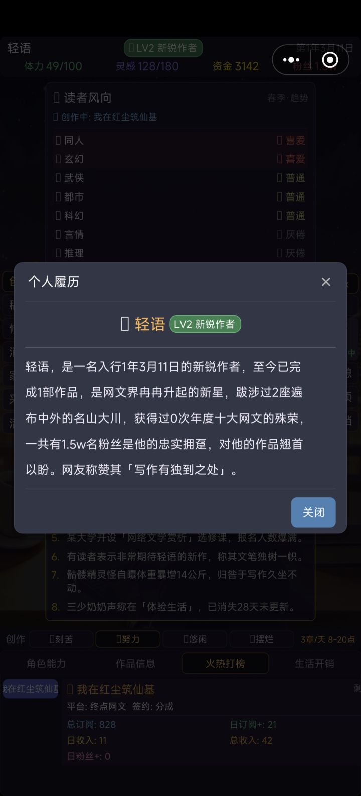 还想和您说明一下新版本的更新。1.剧情投入修改后可以在四项剧情中轮替,保证你一直是通过剧情在加分。之前由于我拉长了剧情恢复期,一般要在6个剧情中轮替,所以难度同样是下降的,这个对于老玩家应该不是坏事。对于新玩家,则通过爬山开剧情盲盒,推动很多人走上题材专精的路线。2.我加入了8个NPC作家,可以着重去刷自己专长领域作家的好感度,可以通过商定作品提高作品综合评分,这也是为了给经验不足,选错了剧情把作品分数搞底的玩家,多一条救赎之路,大致如此,祝你开心