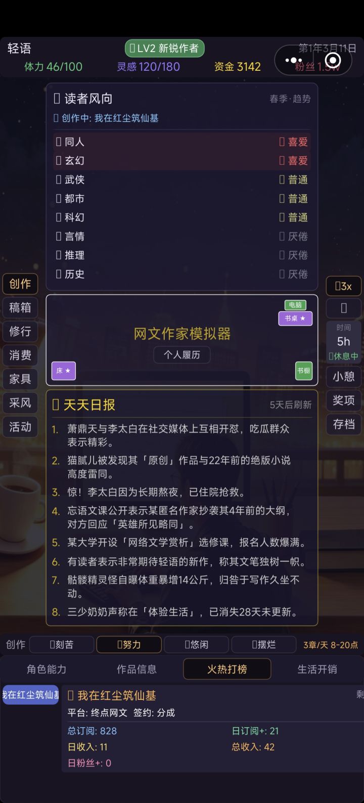 以及,现有的游戏机制决定了最快的赚钱方法是频繁的写书,然后蹭到新书排行奖励就直接太监切掉,再开下一本接着赚钱。只能说很符合现在的平台状况了,但是这真的是作者你想要的吗?