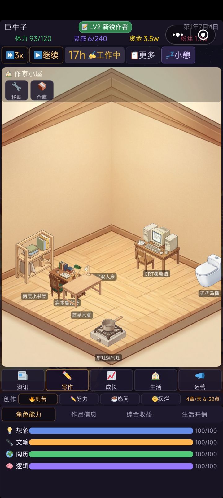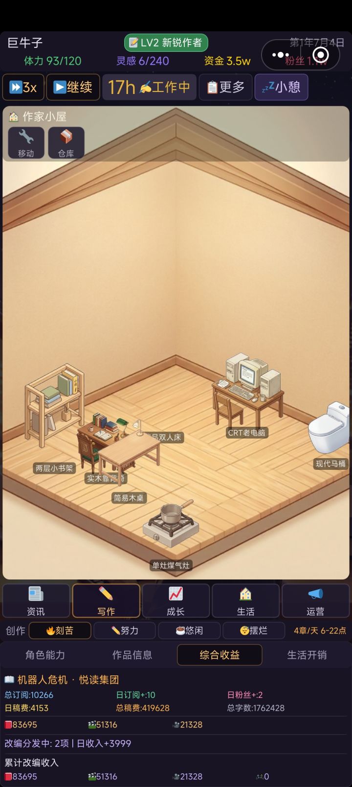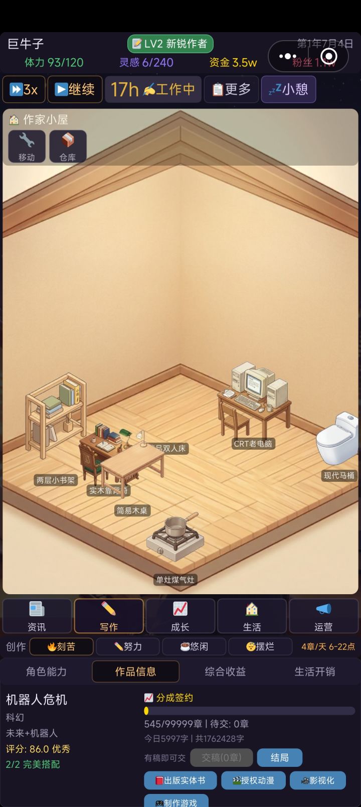 1.不会放弃作家小屋。2.新增粉丝涨粉家具。3.新版本已增加,在上传审核4.那很抱歉了,但我暂时不打算再增加新功能,转而专注自己体验一段时间,毕竟这游戏不只是给你们,也是给我自己做的。综上,祝你开心
