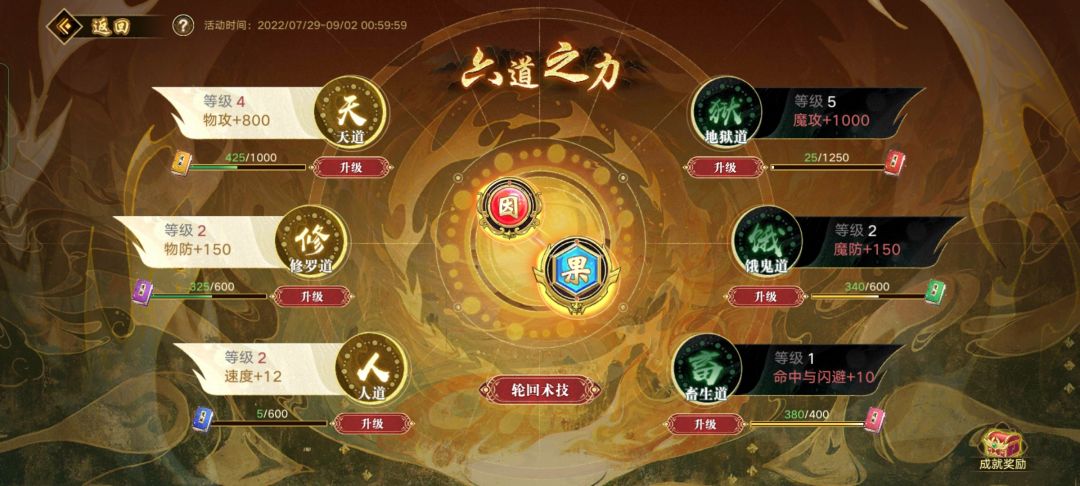 下图活动六道之力配置,差一点等级影响不大,主要要拉满防御齐次是攻击(前段时间刷攻击刷的多了点所以双攻六道等级比较高)。