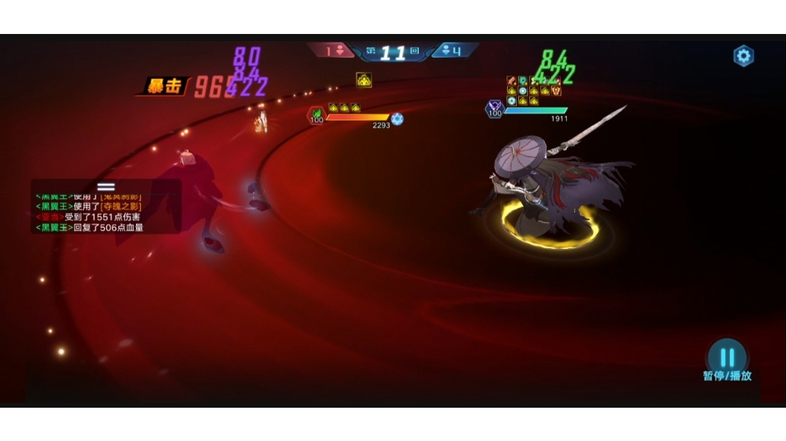 这一把比较有代表性,可以看出首发黑翼王的局限性十分明显,我方画皮火机一拳带走。同时后面的亚当被秒杀也可以看出黑翼王极高的斩杀线,为了看的更清晰我把封面换成斩杀时的伤害。可以看出,黑翼王大招即便暴击也只有965点伤害,对亚当威胁不大,但配合特性和大招吸血能打出586点额外伤害,相当于最大体力值1/3的斩杀线,非常恐怖。