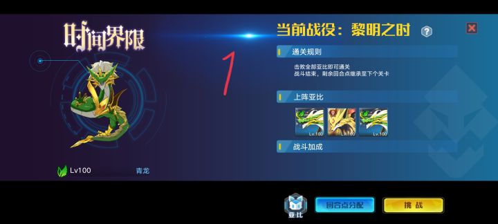 黎明之时第一关✨对面阵容:青龙、神无月、青龙✨具体思路及注意事项:对面都被圣灵系克制,又要保证回合数,所以核爆藏零一是很合适的。而且对面均为男性亚比,夜兰可以减双防,增伤。✨阵容:藏零一、夜兰✨回合选择:藏零一:4、夜兰:4。第二关✨对面阵容:逍遥、风暴龙、逍遥✨具体思路及注意事项:这关可以藏零一也可以凤凰,四岁选择的凤凰。也可以跟第一关一样使用藏零一。✨阵容:凤凰、吉拉、孔雀✨