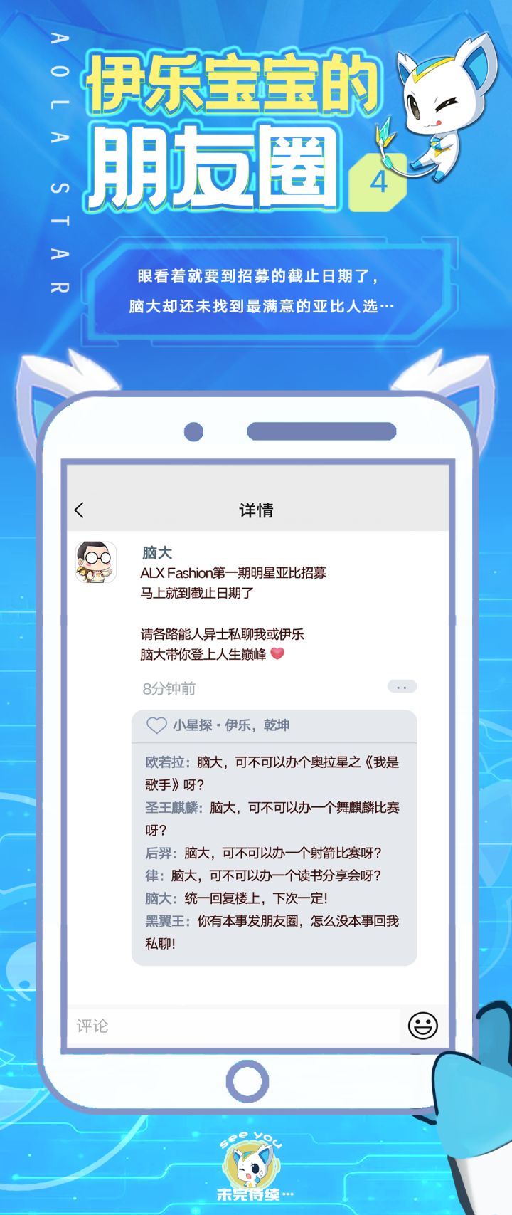 ALX Fashion第一期明星亚比招募马上要结束了在脑大忍不住发了一个票圈之后,出现了一个神秘的点赞!震惊!时隔1年多,辣个男人,似乎出现了!连脑大都情不自禁的发出30S语音—(请大家自行脑补)咳咳......最近本宝宝一定要注意点自己的言行......你,懂,得干饭去了!希望今天可以早点发......公告o(╥﹏╥)o