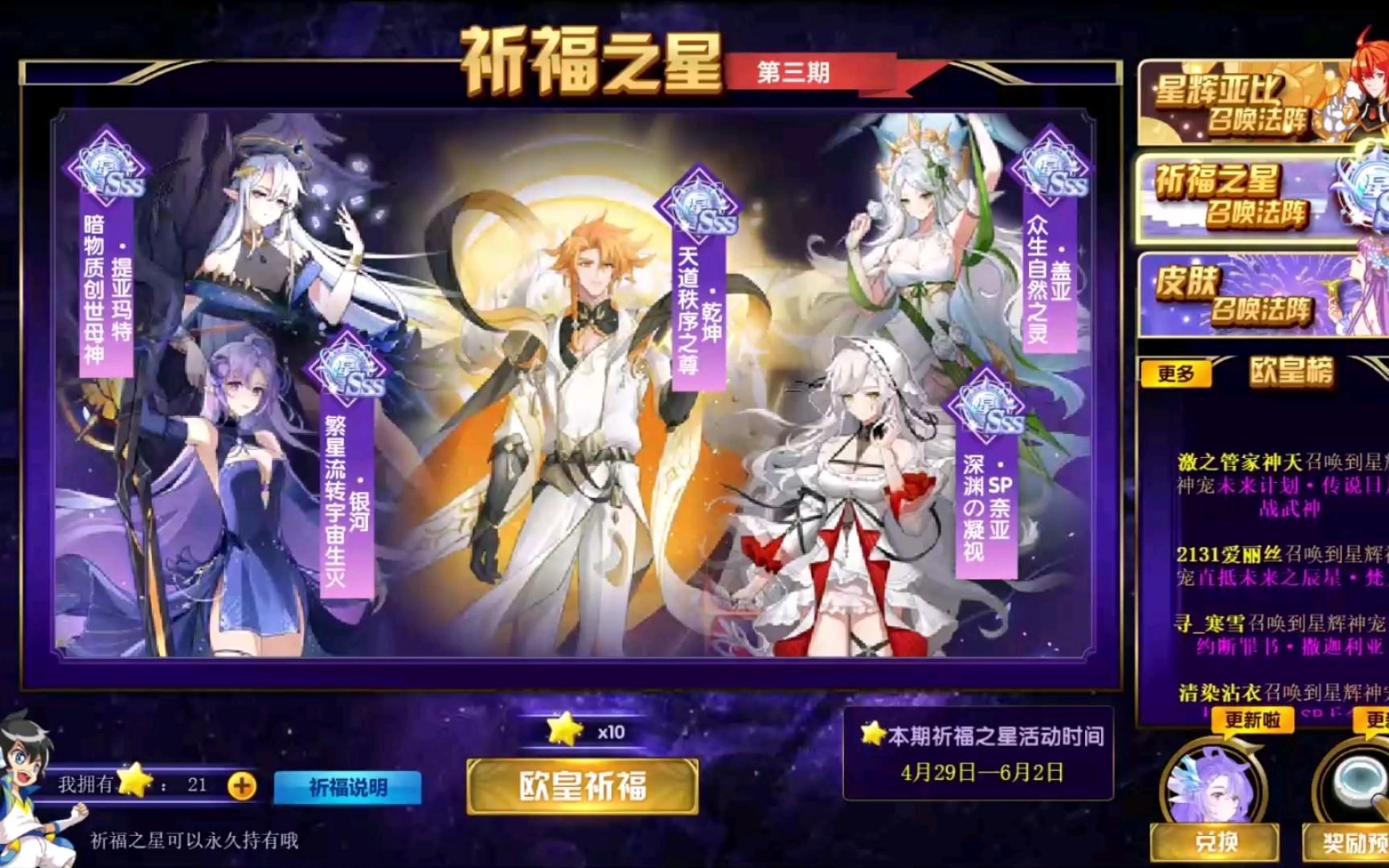 本期祈福抽了30连抽,获得的还算可以的亚比有一只通灵天天,一只god,一只王者女娲和一只姜子牙,爆率感觉真的不高 ,不知道大家又抽到什么呢,可以分享一下吖(づ ̄ ³ ̄)づ