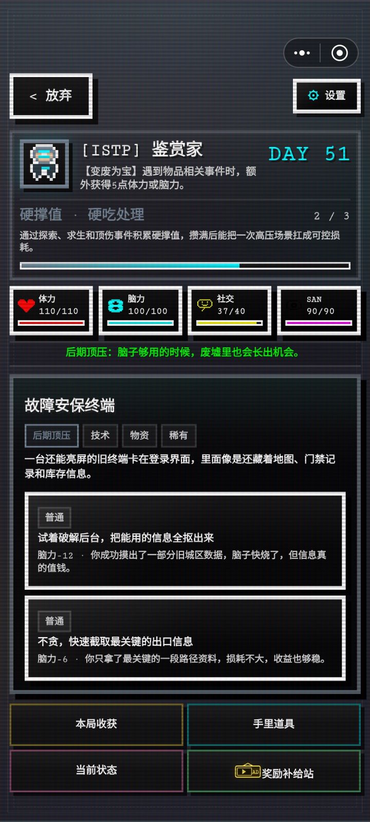更新:开了第二把,死了是因为手贱选了一个扣损很大的选项(但个人觉得应该是伪装成高危选项的即死选项),剧情还是无尽循环,说明跟MBTI没关系。