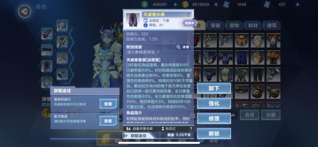 (二)关于大角鹿心得 装备搭配方面的话,我现在是有2套 1.天威套 天威套的话更适合电属性武器,可以搭配雷仗,打本,打船,爬塔什么的伤害还是很高的,也就是说更适合pve,我个人不推荐大角鹿用天威套和雷仗打架,基本蓄不了力,不蓄力伤害并不高 2.唤雷套 唤雷套是81级的起源射手装备,我也是升到了91级,因为pvp我玩的武器是冰属性的,唤雷套就对雷属性提升并没有那么多,比较全面,我搭配的武器是雪驽以及