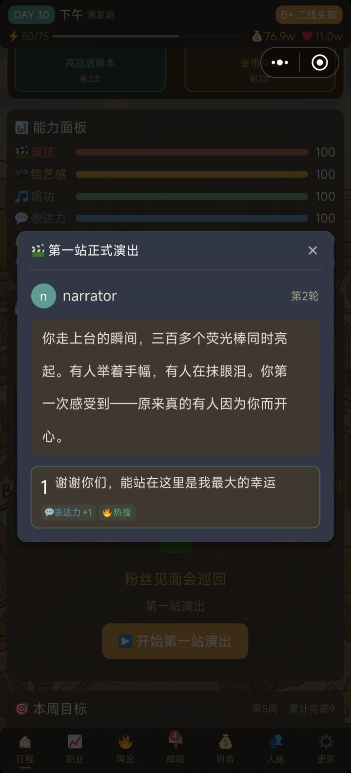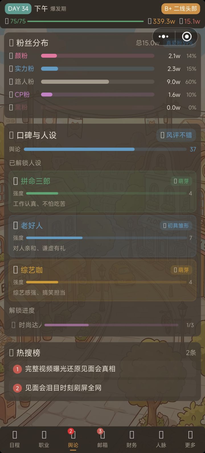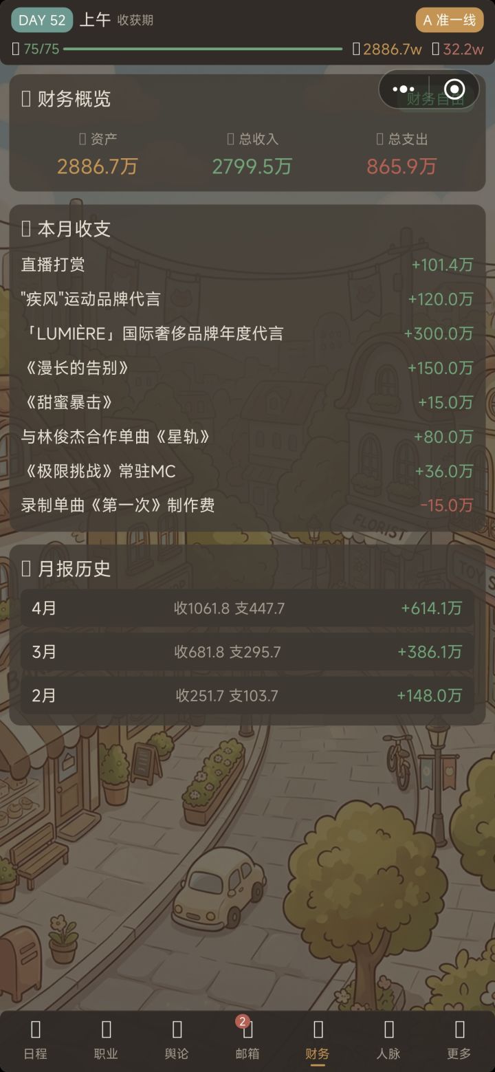 后面属性全满后就没多少可玩性了,天天直播陪粉丝或者搞社交,到最后几乎是因为想看着自己能到那一步的劲儿在支撑着玩