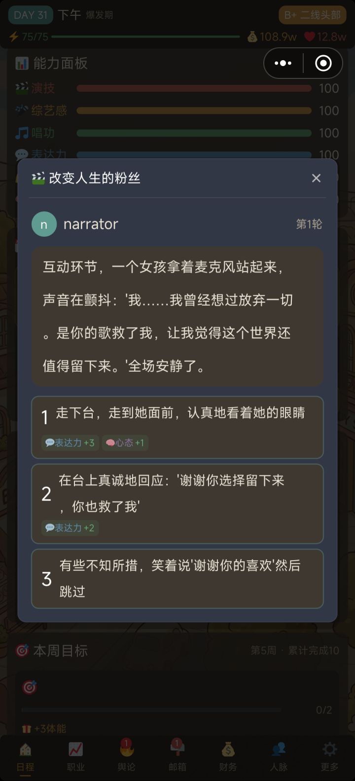 然后就是不停安排增加数值,数值满了以后也不知道有什么用,可能我没有玩到吧