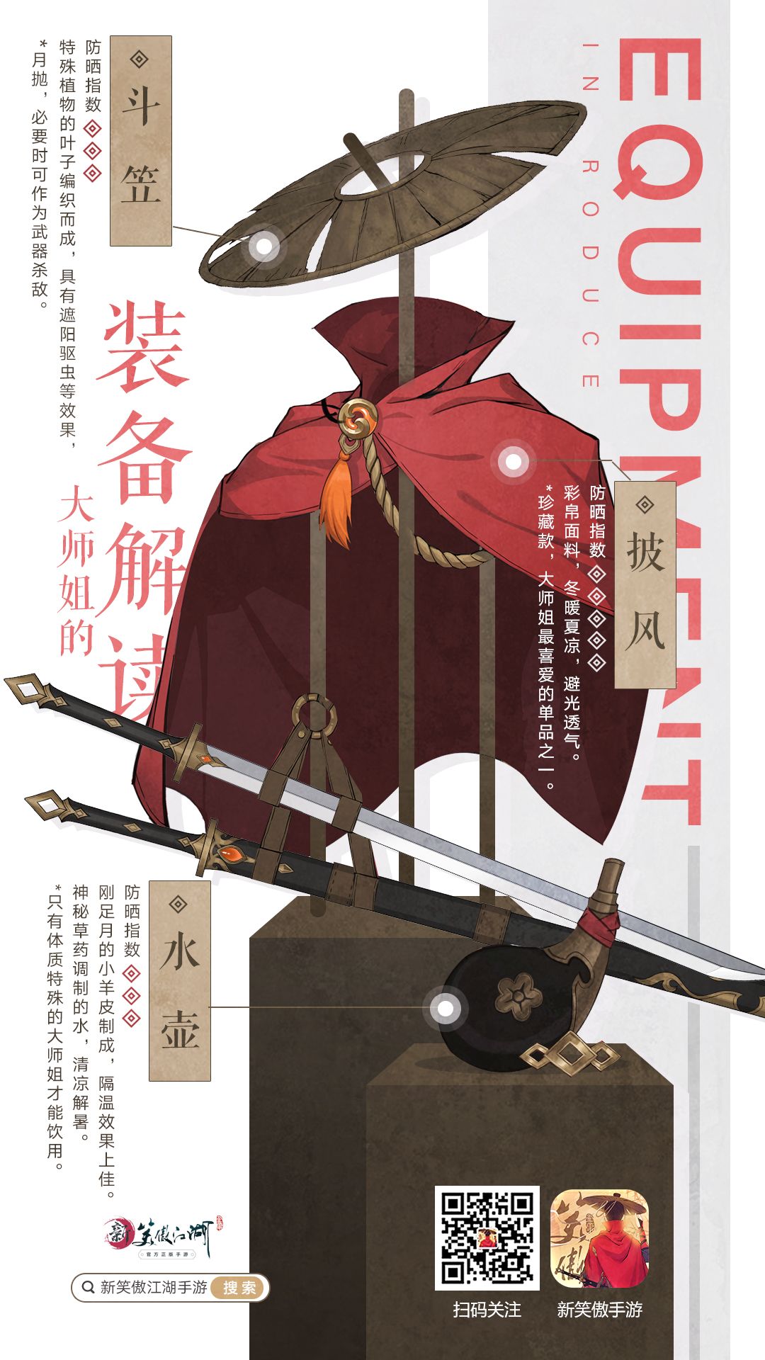 "浮生浪迹笑明月,千愁散尽一剑轻" 伺机而动一剑封喉,血染凝脂美貌依旧。 大师姐也是个精致的江湖女孩 一份大师姐的装备解读送给大家。 实乃闯荡江湖的入门参考!必备指南! 少侠~ 从此!笑傲江湖!走着~喵~ ❤❤❤教主喵的互动话题❤❤❤ 如果只许带一件道具闯荡江湖~少侠会带什么呢? 回帖中获赞数前3名的少侠将获得教主猫小周边一份~喵~ 9月14日开奖 已开奖~