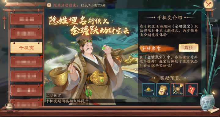 “金蟾聚宝-隐秘模式”重启!少侠们参与埋宝升品概率提升!盗宝后将处于匿名状态!(最开心的模式来了!)自由探寻宝物吧!【活动时间】:8月20日-9月3日【活动说明】:1、千机变活动期间,部分玩法限时开启主题模式,奉上全新竞技体验。2、所涉及主题玩法 奖励限时提升,并于活动结束后回归常规模式。【隐秘模式说明】1、在《金蟾聚宝》 玩法中,参与埋宝,金蟾随时间提升更好品质的 概率提升2
