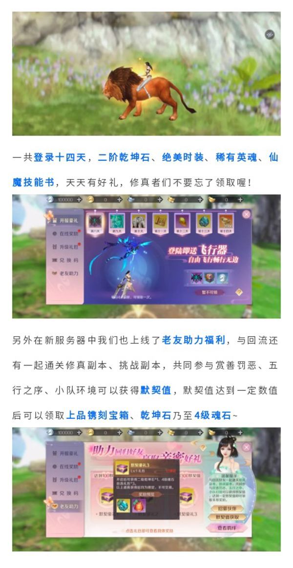 本次新服开放时间为:12月16日 开放新服为 ↓↓↓ 互通微信387区-金戈 新服即将开启,呆毛为修真者们准备了不少开服好礼,一起来看看吧~ 开服豪礼✚● ○ 每日进入完美大陆,即可领取开服豪礼。限时稀有坐骑、+8职业武器、天书、稀有精灵、飞行器、大量元宝都在等着你~ 连续登录十四天,高级宝石、绝美时装、仙魔技能书,天天有好礼,修真者们不要忘了领取喔! 另外在新服务器中我们也上线了老友助力福利,与