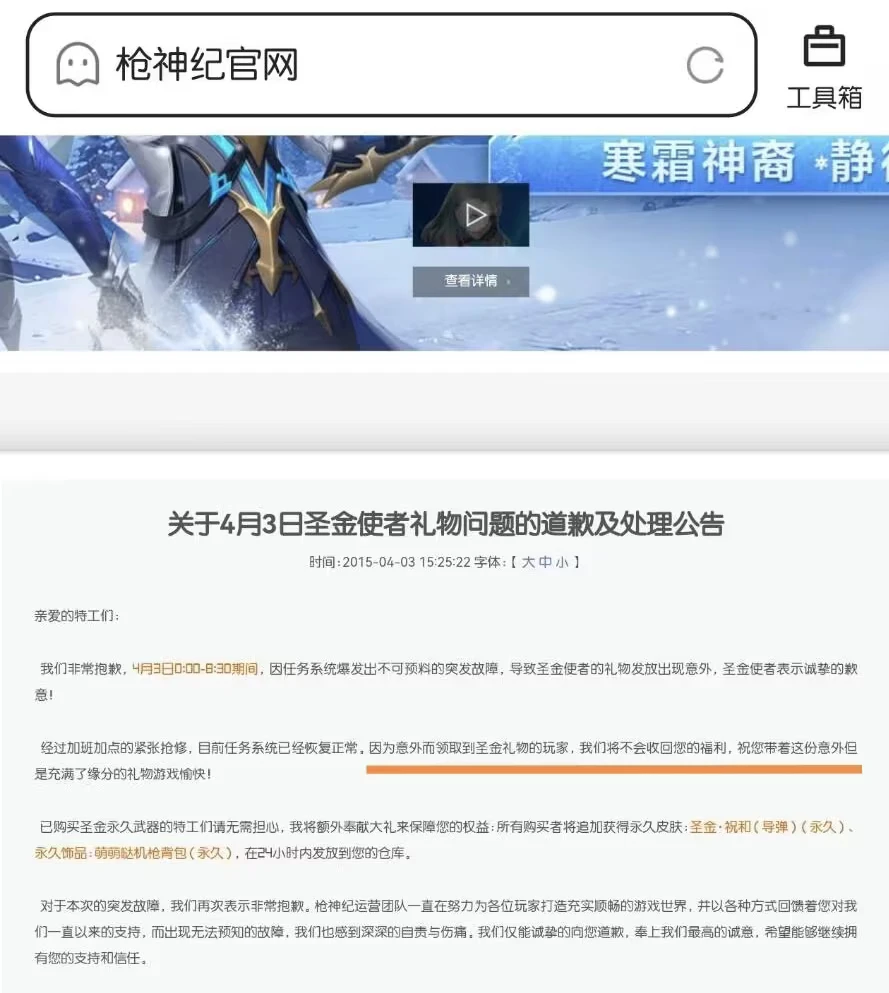 亲爱的逆行者们:非常抱歉,由于运营团队在内部调试时的严重操作失误,我们不小心将【幽冥毒皇-月陨之誓礼包】误作为全服奖励发放了出去。我们工作的重大疏漏,完全打乱了大家正常的游戏体验。为了维护游戏长期的公平环境和所有玩家的共同利益,确保后续版本和活动的正常进行,我们不得不带着万分歉意,回收这部分误发的金枪及挂饰。我们深知给予又收回的感觉极其糟糕, 为了最大程度地弥补我们的过失和给大家带来的困扰